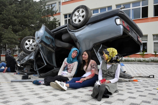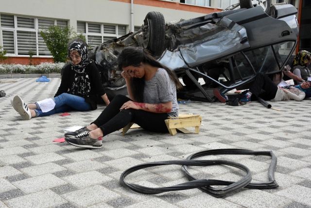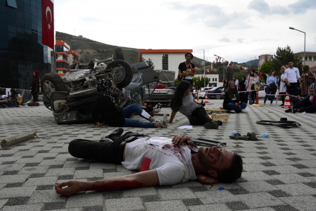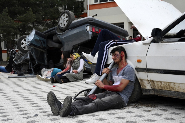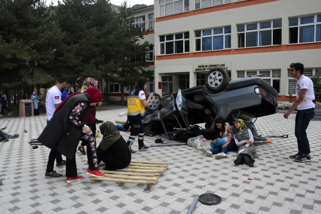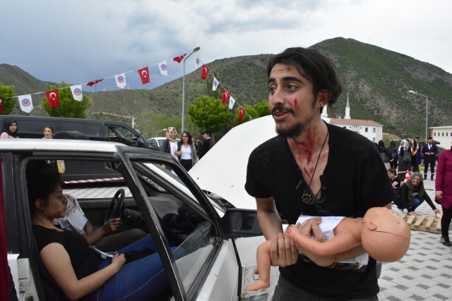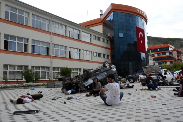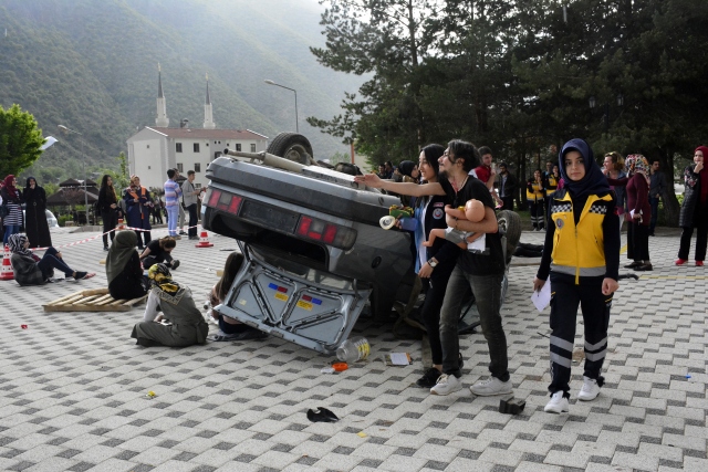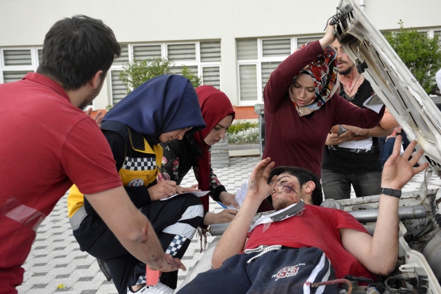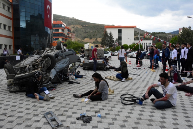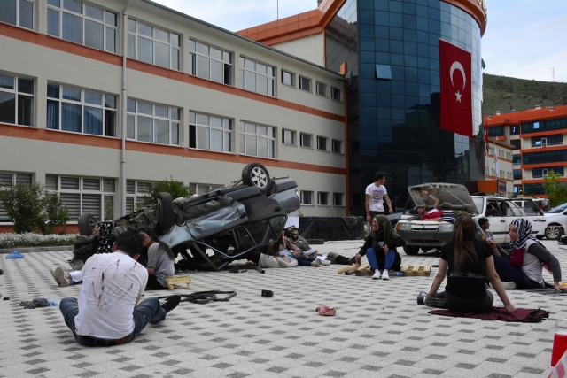 Gümüşhane Üniversitesi öğrencilerince acil durumlarda hareket kabiliyetinin ölçülebilmesi amacıyla gerçekleştirilen triaj tatbikatı gerçeği aratmadı. Hurda otomobillerin kullanıldığı tatbikatta, senaryo gereği bombalı eylem sonrası yaralanan çok sayıda hastaya durumlarına göre öncelik sırası verilip müdahale edildi.