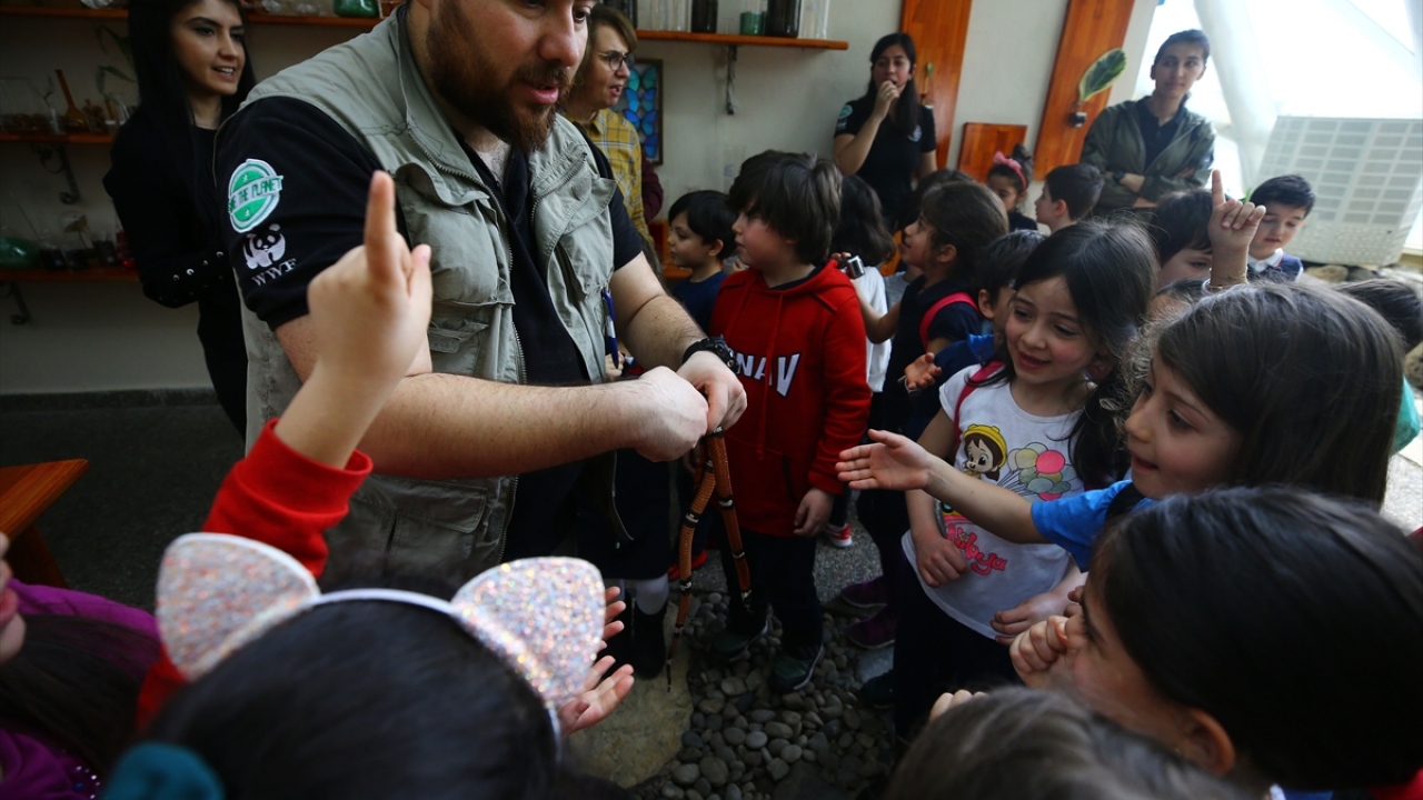 Tropikal bahçeyi gezmeye gelen çocuklara tropikal hayvanlar hakkında bilgi veriliyor.