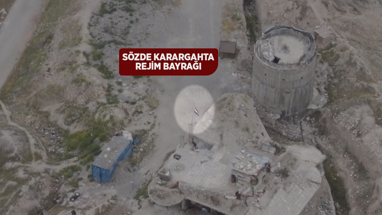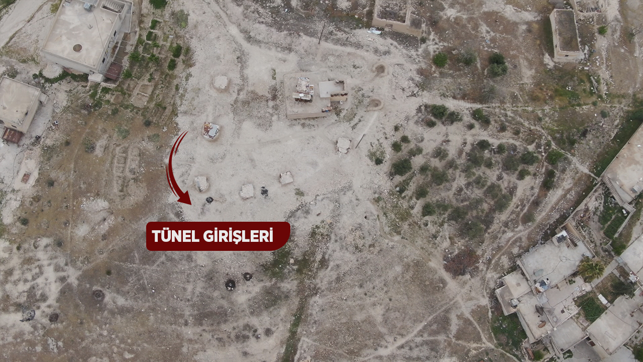Dron görüntülerine teröristlere ait çok sayıda mevzi ile birlikte tüneller yansıdı. Suriye rejimine ait bayraklar da terör mevzilerinde dalgalanırken kaydedildi.
