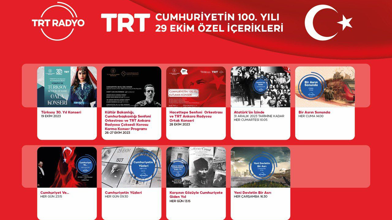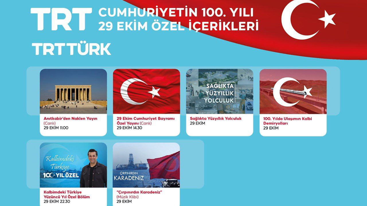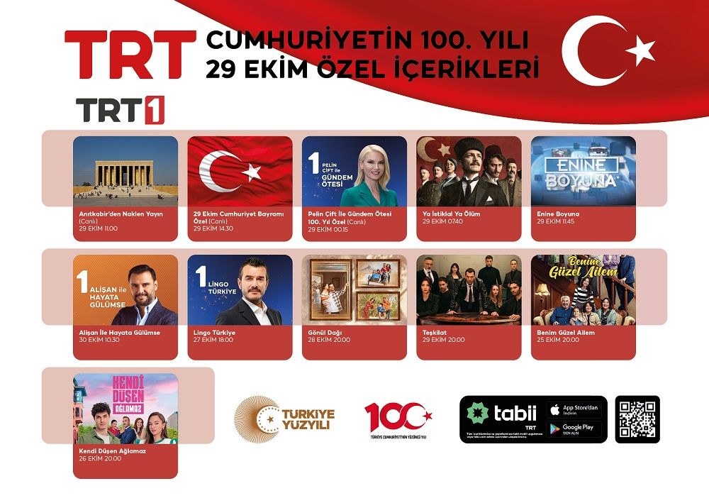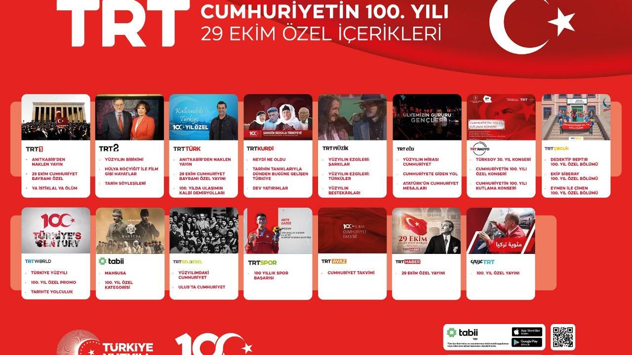 Gazi Mustafa Kemal Atatürk önderliğinde ve Türk milletinin seferberliği ile kurulan Türkiye Cumhuriyeti’nin 100. yıl dönümü için hazırlanan birbirinden özel içerikler TRT’nin televizyon ve radyo kanallarında izleyici ve dinleyiciyle buluşacak.