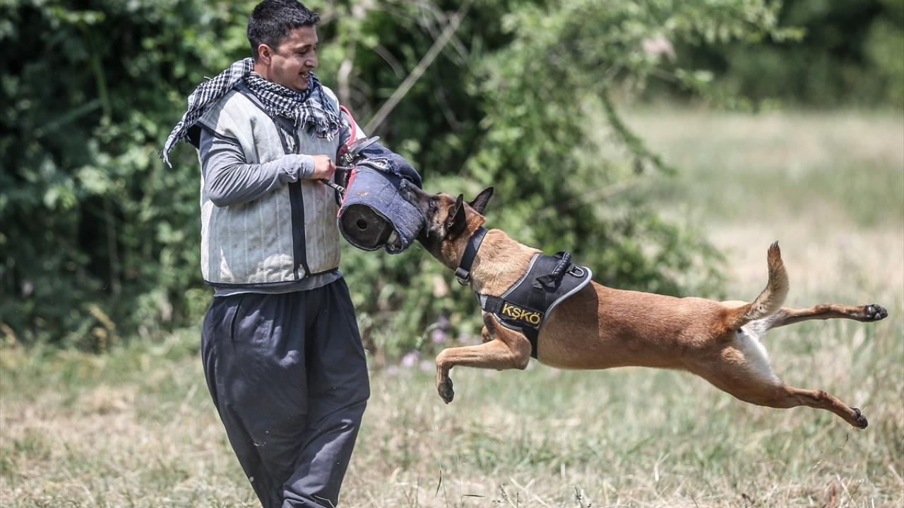 Eğiticisinin kontrolünde olan keşif köpeklerine uzmanlarca detaylı olarak itaat eğitimi veriliyor.