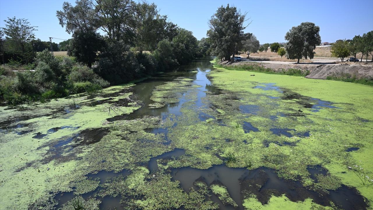 Kaynağını aldığı Bulgaristan`da ve geçtiği Edirne`de yağışların azlığı nedeniyle su seviyesi düşen nehirde geniş ot öbekleri oluştu.
