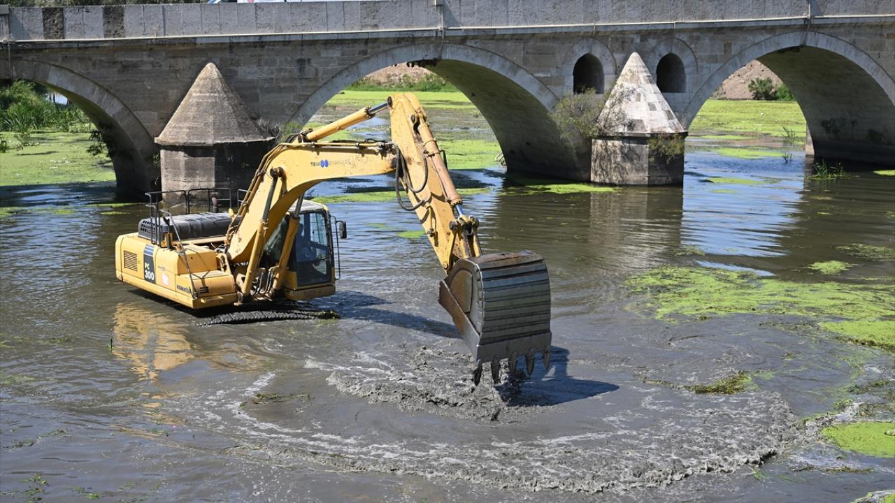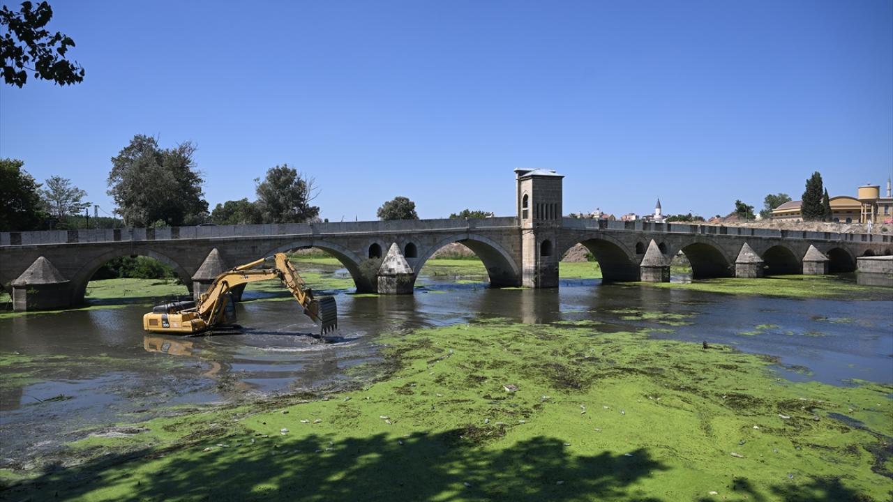 Devlet Su İşleri (DSİ) 11. Bölge Müdürlüğü ekipleri, Tunca Köprüsü civarında yatağı genişleyen nehirde su akışını engelleyen ot öbeklerini ve üzerinde biriken çöpleri temizlemek için çalışma başlattı.