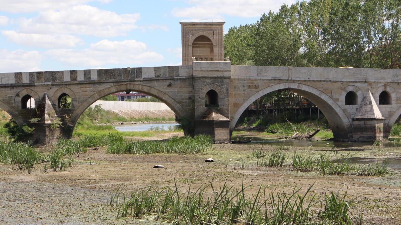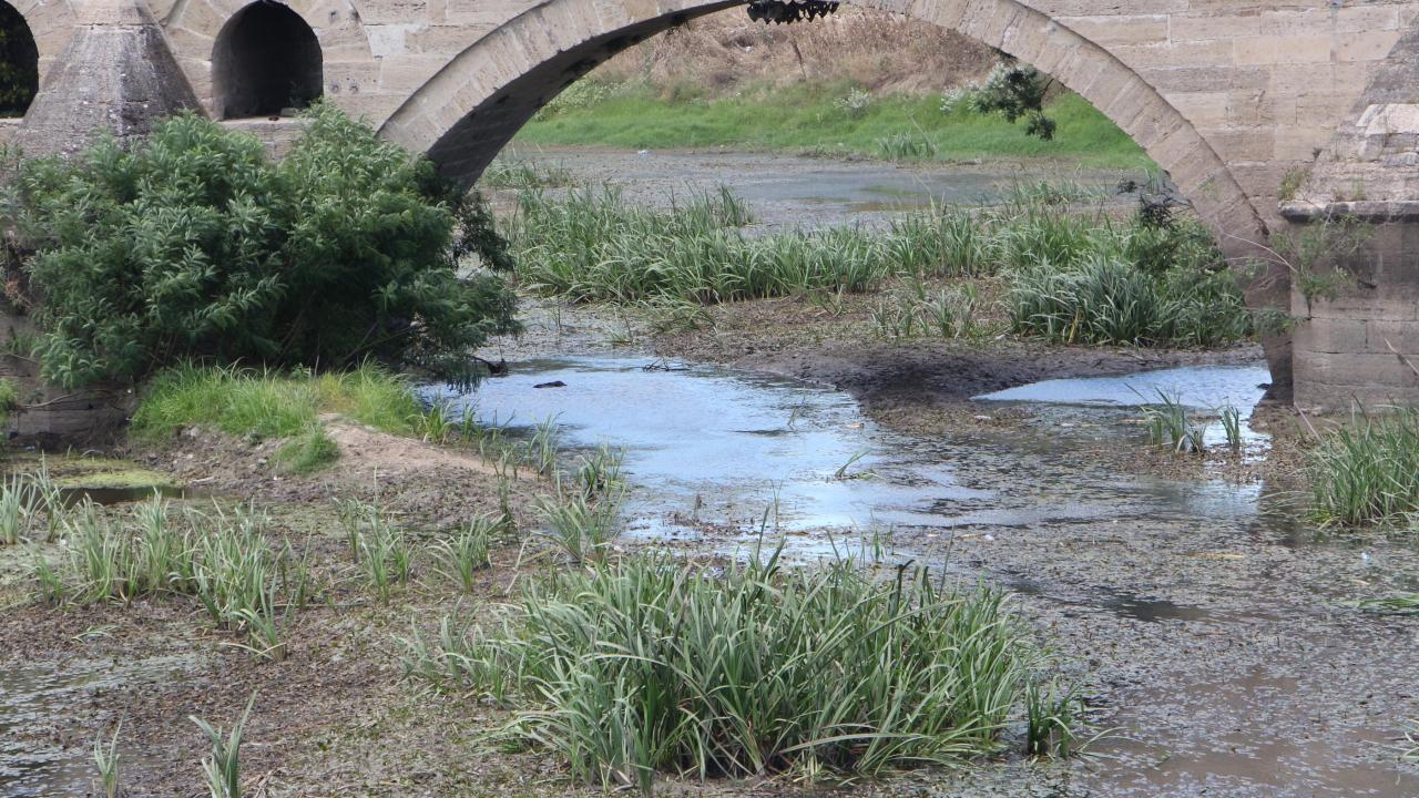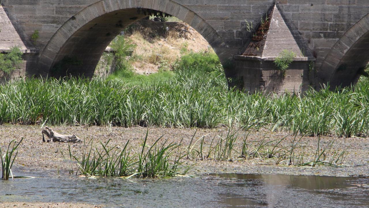 Tarihi Tunca Köprüsü`nün olduğu bölümde, nehrin ortasında, kum adacıkları ve öbek şeklinde otların çıktığı görüldü.
