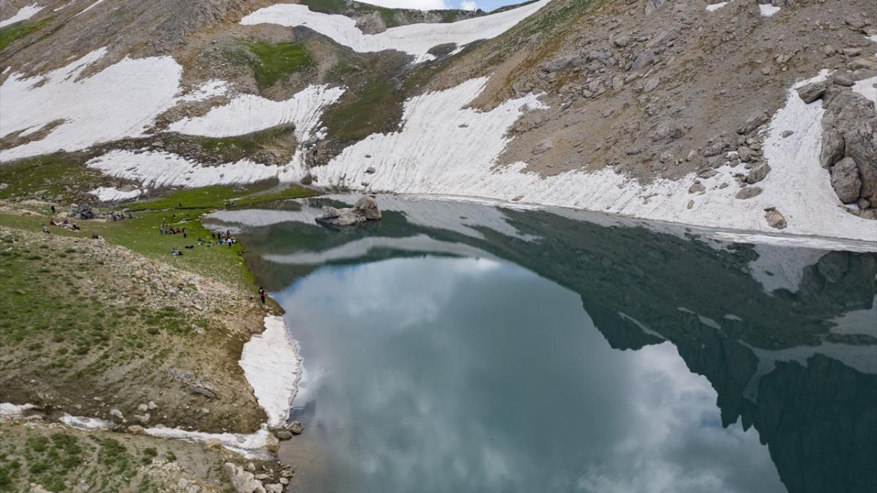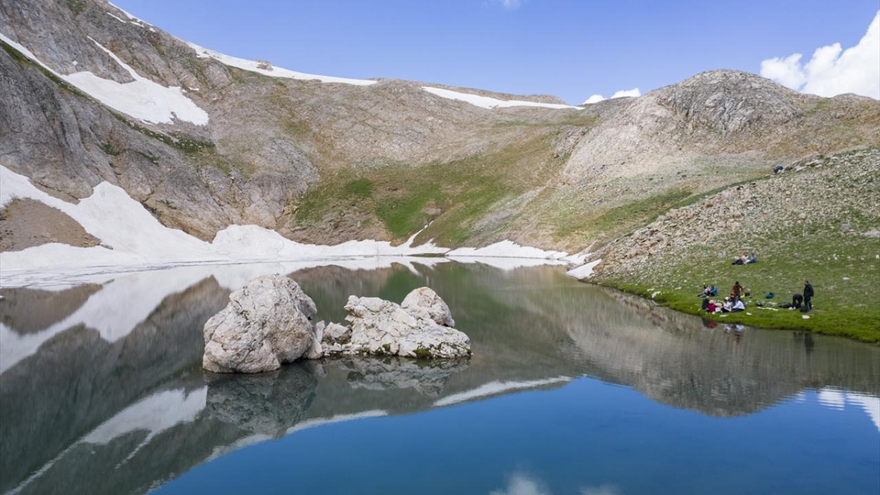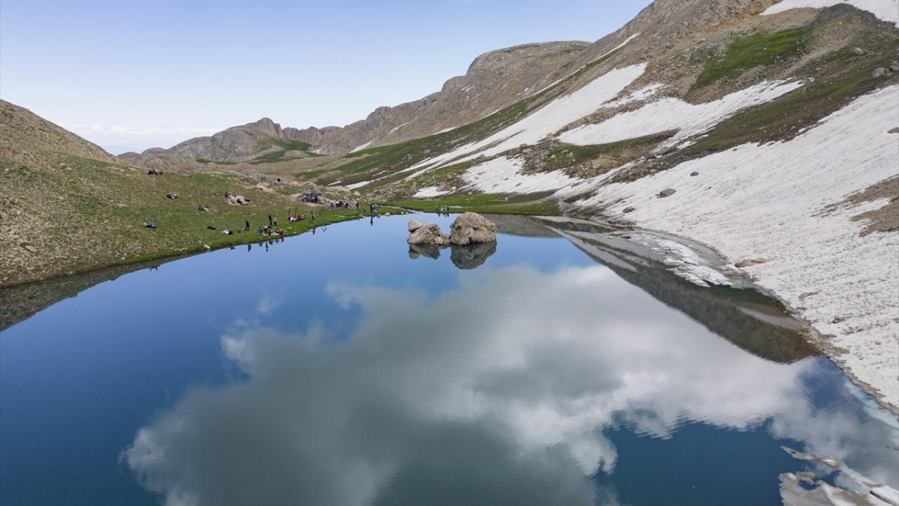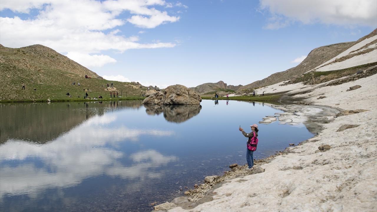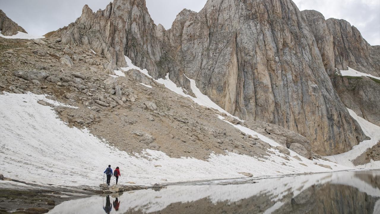 Zirveye doğru tırmanan doğaseverler, 2 saatlik yürüyüşün sonunda Buyer Gölü`ne ulaşıp ilkbahar ve kış manzaralarını bir arada yaşıyor.