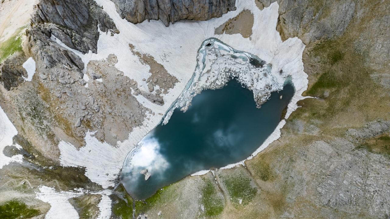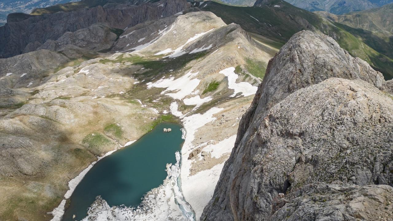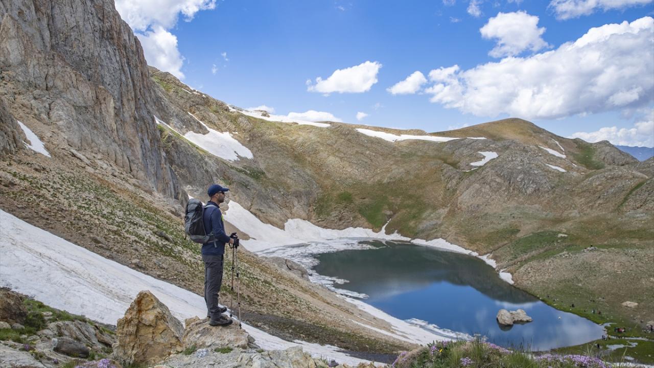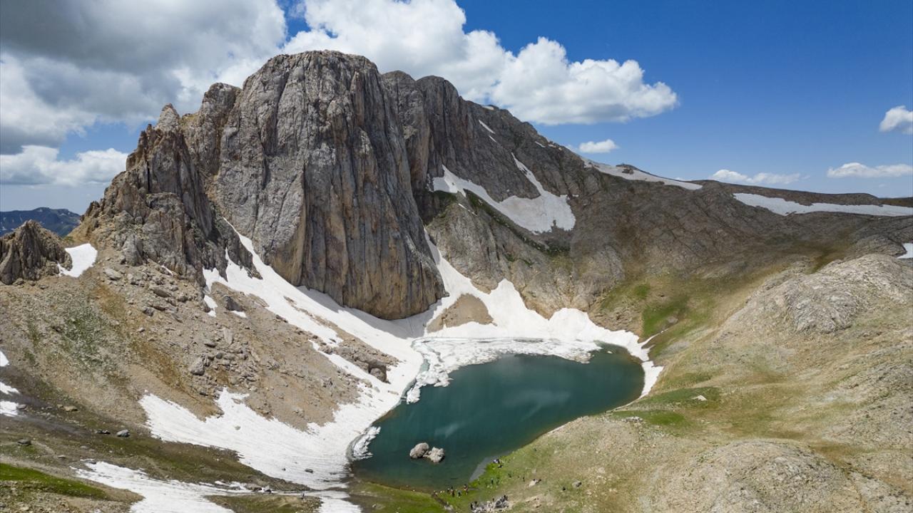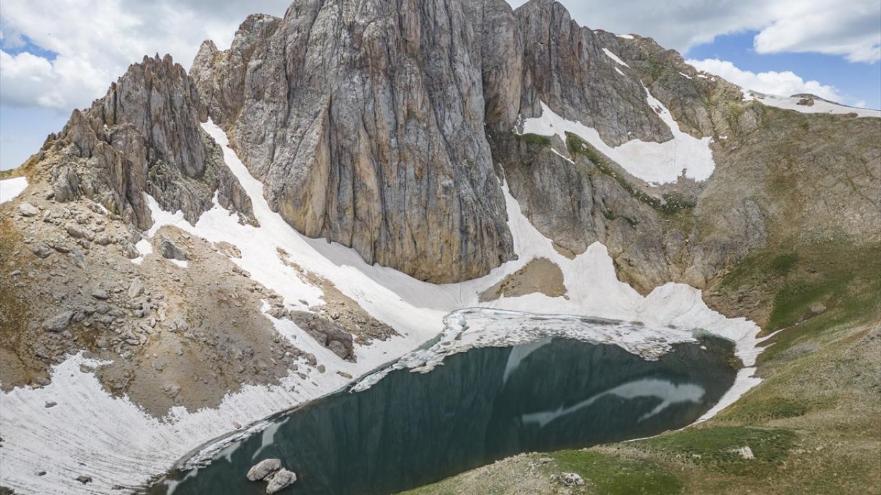 Zirveye doğru tırmanan doğaseverler, 2 saatlik yürüyüşün sonunda Buyer Gölü`ne ulaşıp ilkbahar ve kış manzaralarını bir arada yaşıyor.