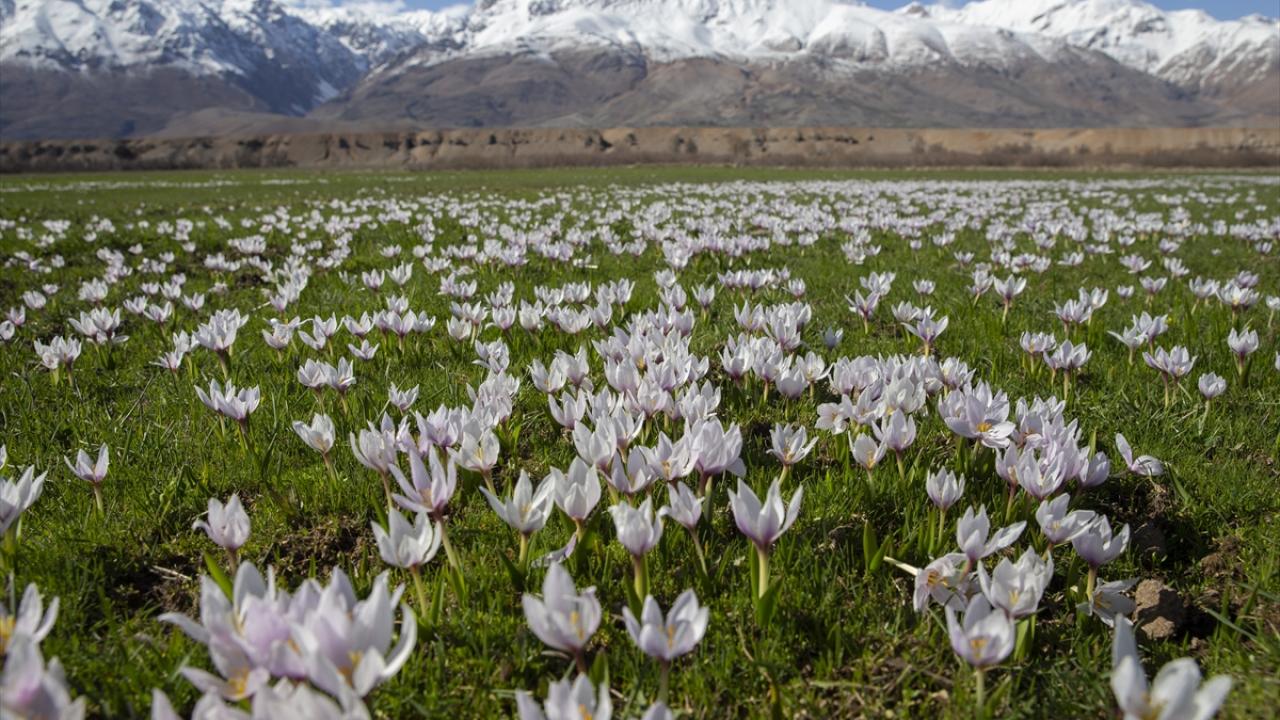 Karla kaplı dağların zirveleriyle bütünleşen sarı, mor ve beyaz renkli çiçekler görüntülendi.