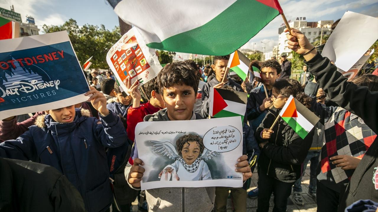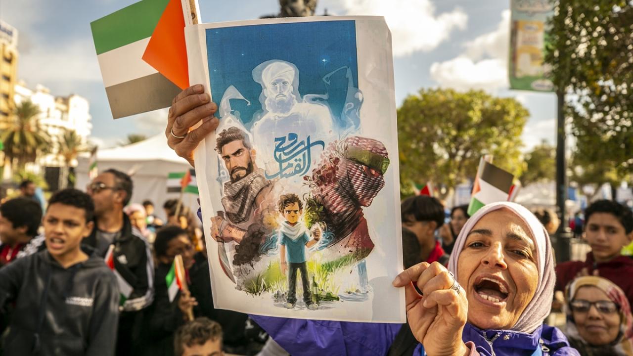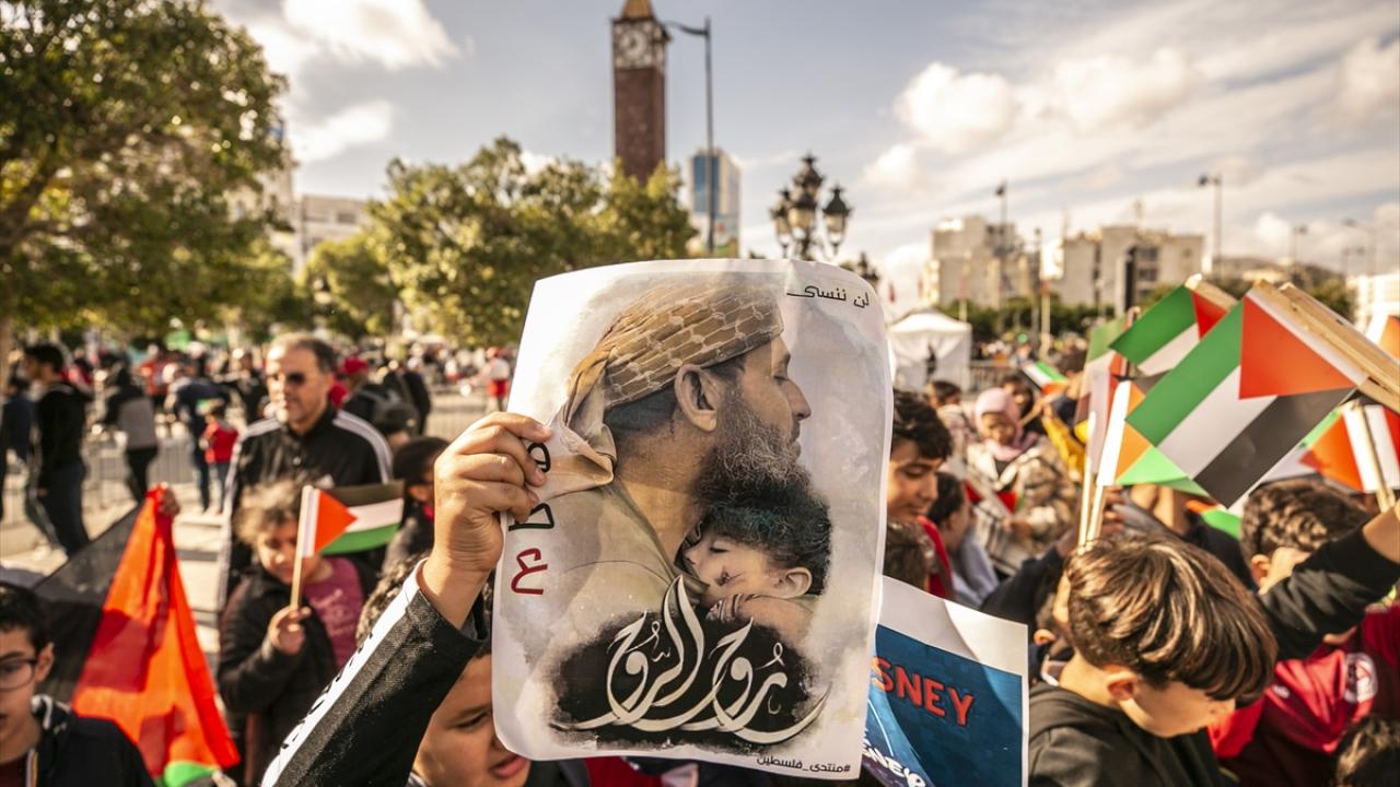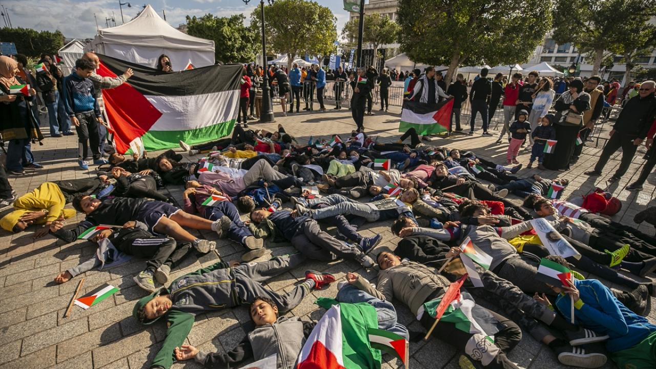 Tunus'un başkenti Tunus'taki Habib Burgiba Caddesi'nde toplanan çocuklar ve aileleri, Filistin'e destek gösterisi düzenledi. Göstericiler, ellerinde Filistin bayrakları ve Gazze saldırılarına tepki olarak İsrail ürünlerini boykota çağıran pankartlar taşıdı.