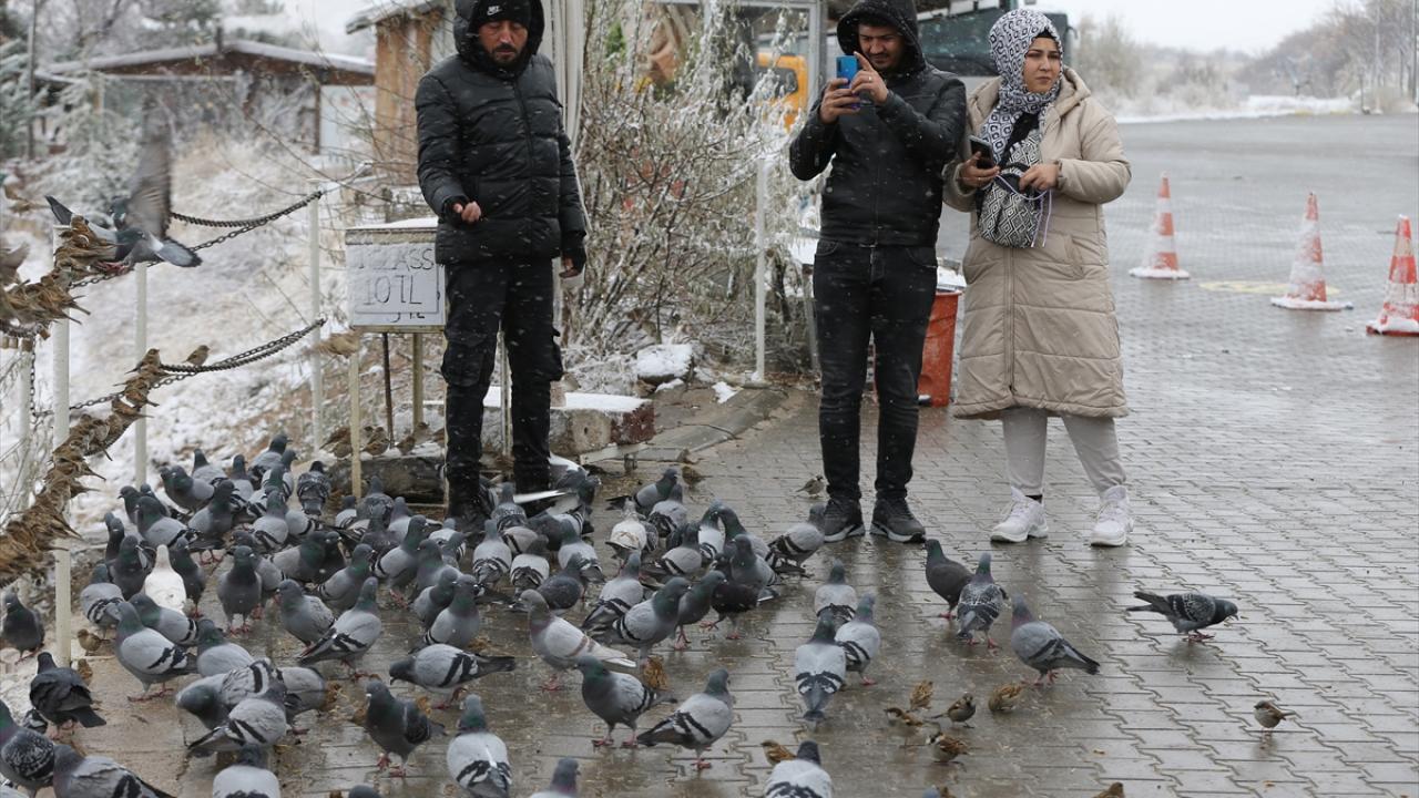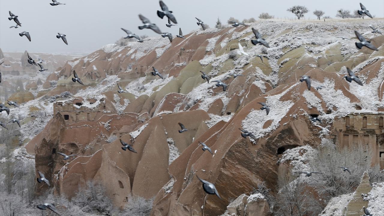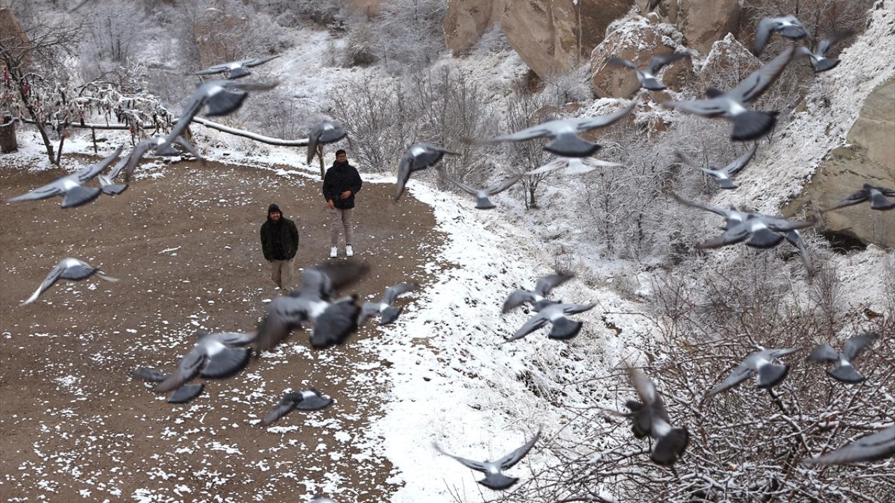 Ürgüp`teki Üç Güzeller Mevkisi`nde gözlem dürbünlerinden doğal kaya oluşumlarıyla kaplı vadileri izleyen turistler, Uçhisar beldesinde Güvercinlik Vadisi`ndeki kuşlara yem verdi.