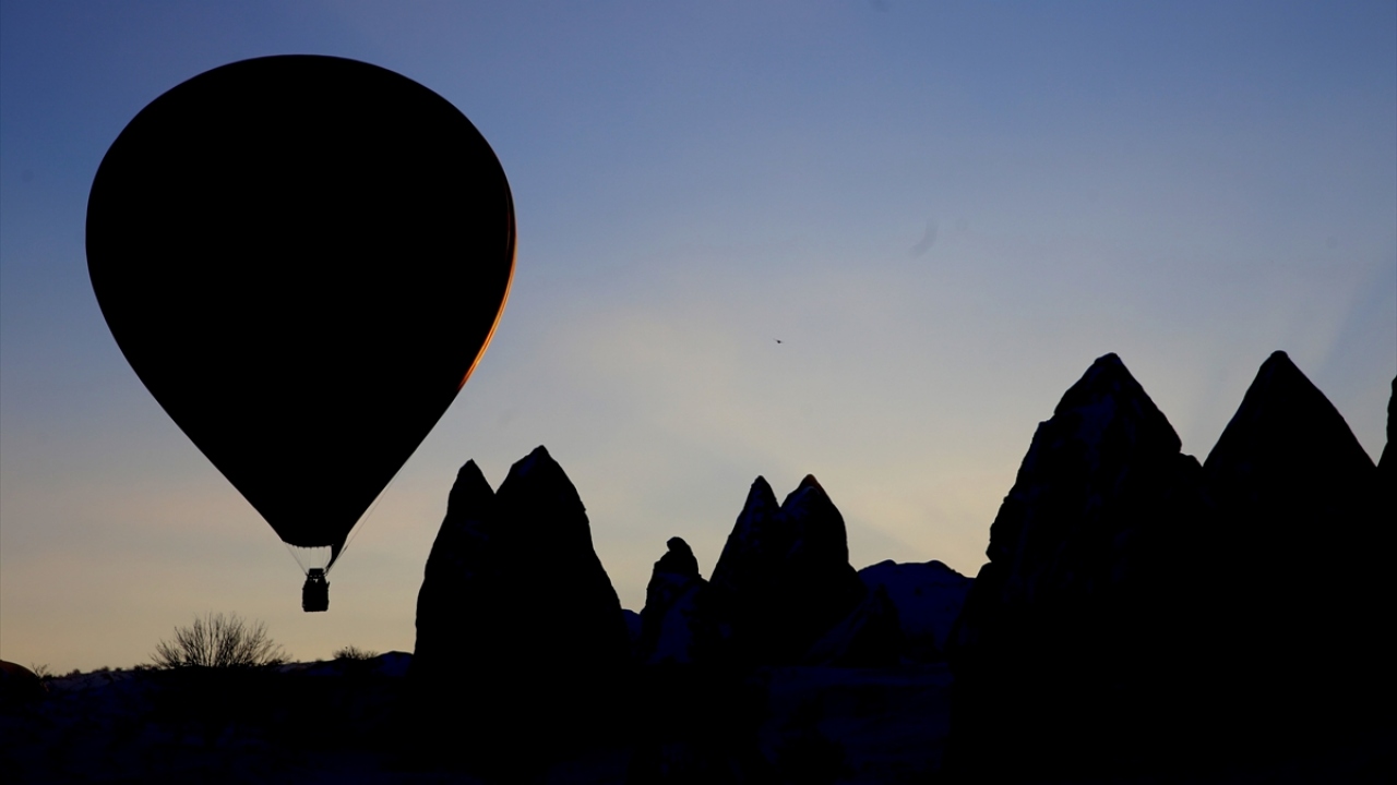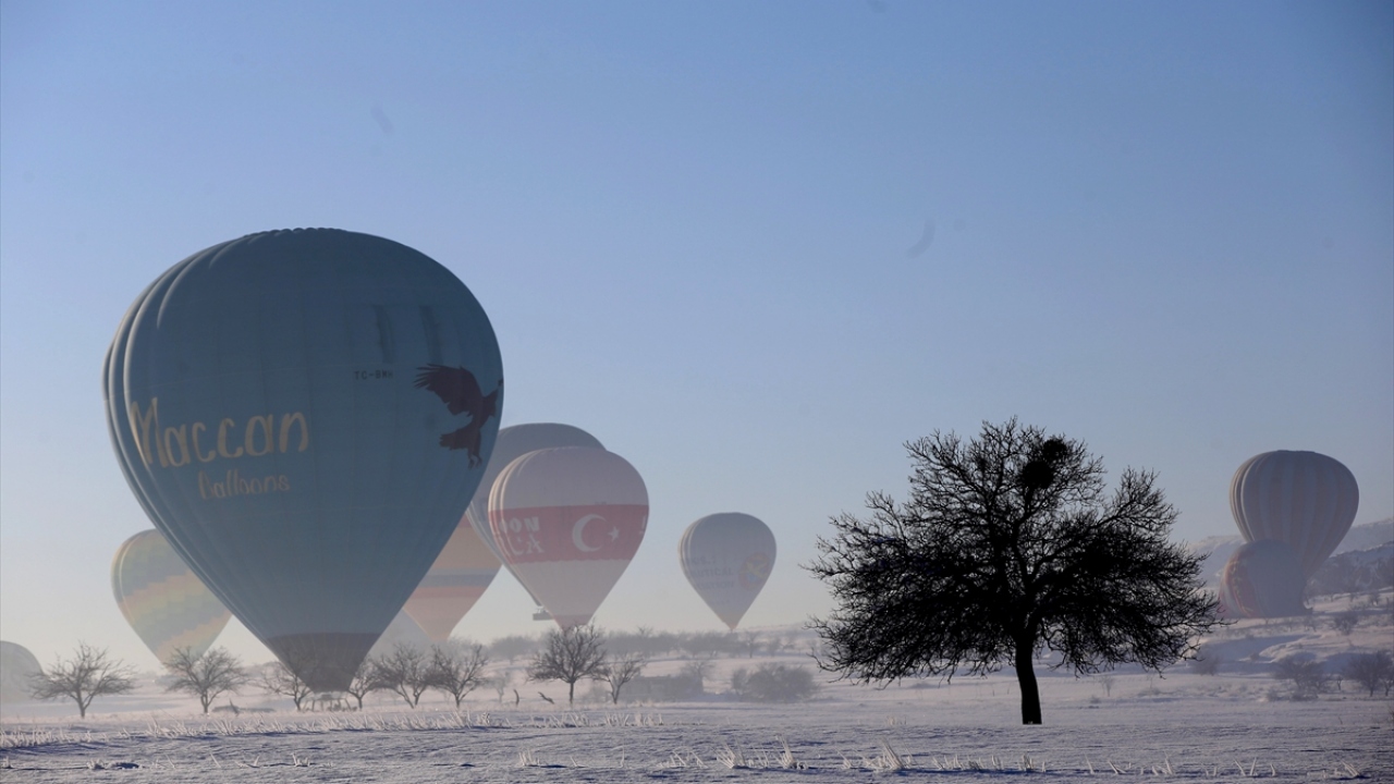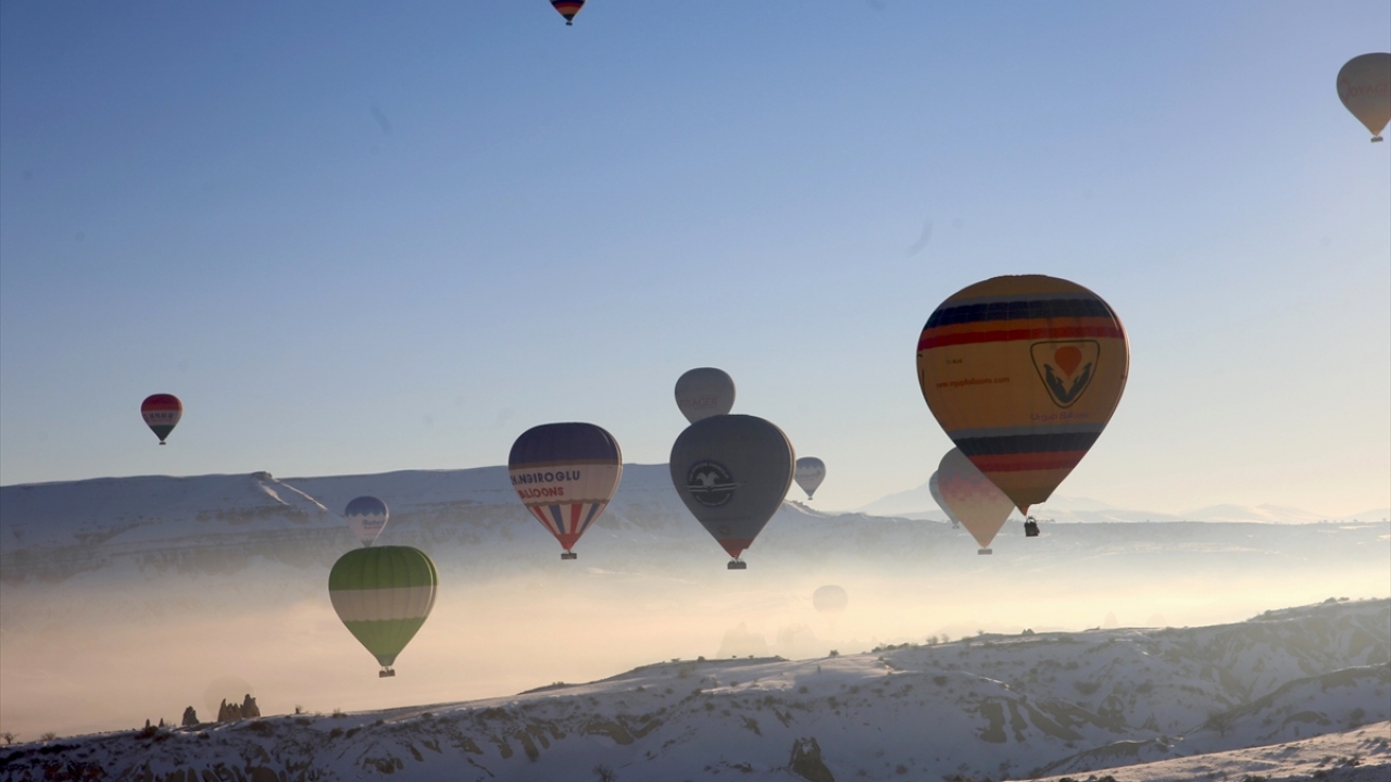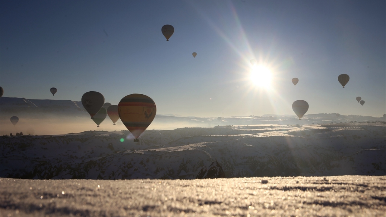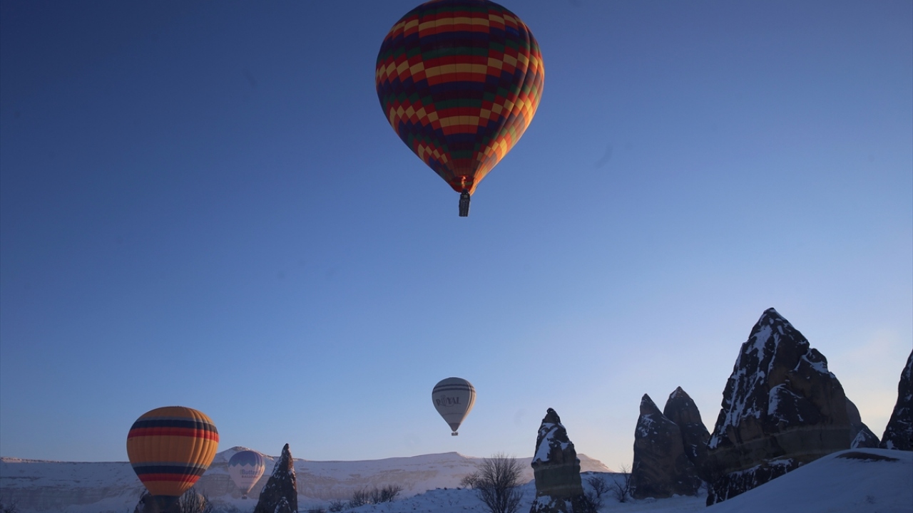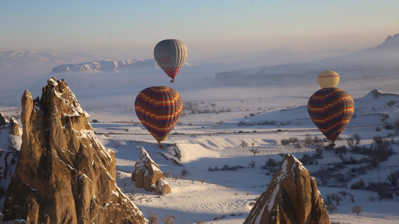 Türkiye'nin peribacaları ve doğal kaya oluşumlarıyla ünlü turizm merkezi Kapadokya'da turistler, karla kaplanan doğal güzellikler ile tarihi ve kültürel zenginlikleri gökyüzünden gördü.
