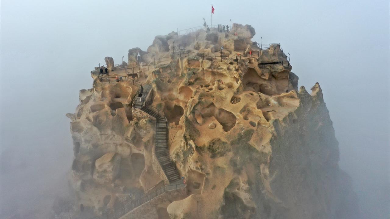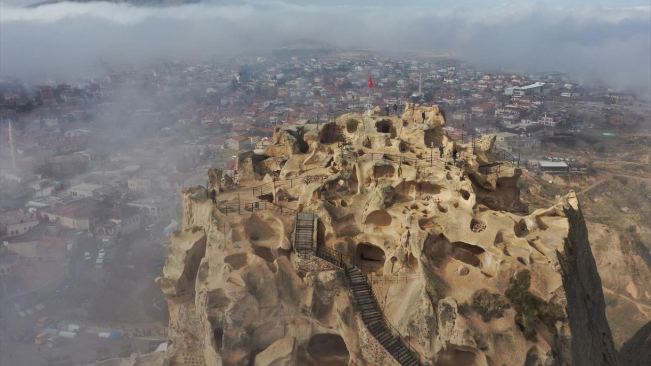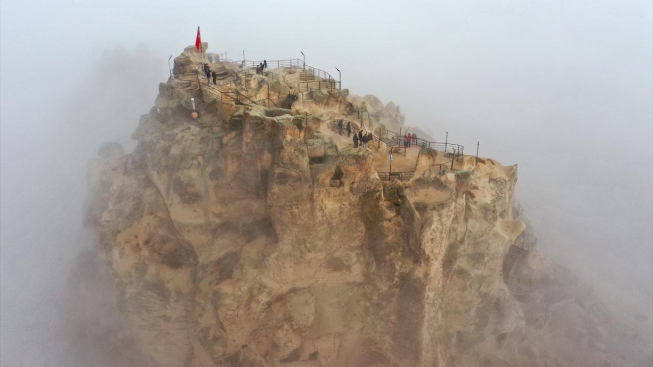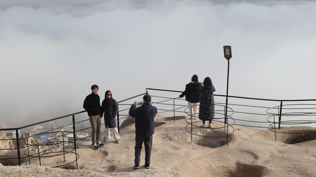 Peribacaları ve ilginç kaya oluşumlarıyla kaplı Kapadokya'yı ziyaret eden turistler, son günlerde sık sık sisle kaplanan manzarayı, bölgenin hakim noktası Uçhisar Kalesi'nden izliyor.