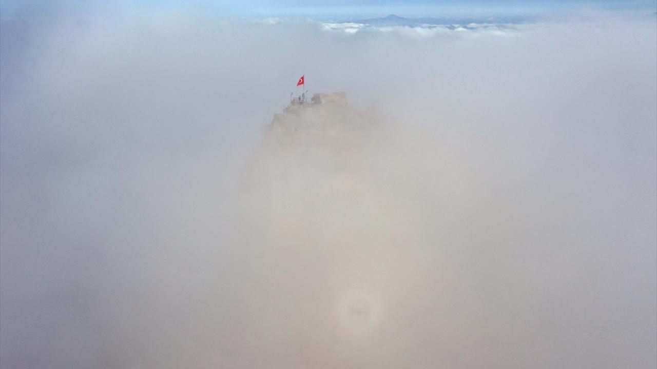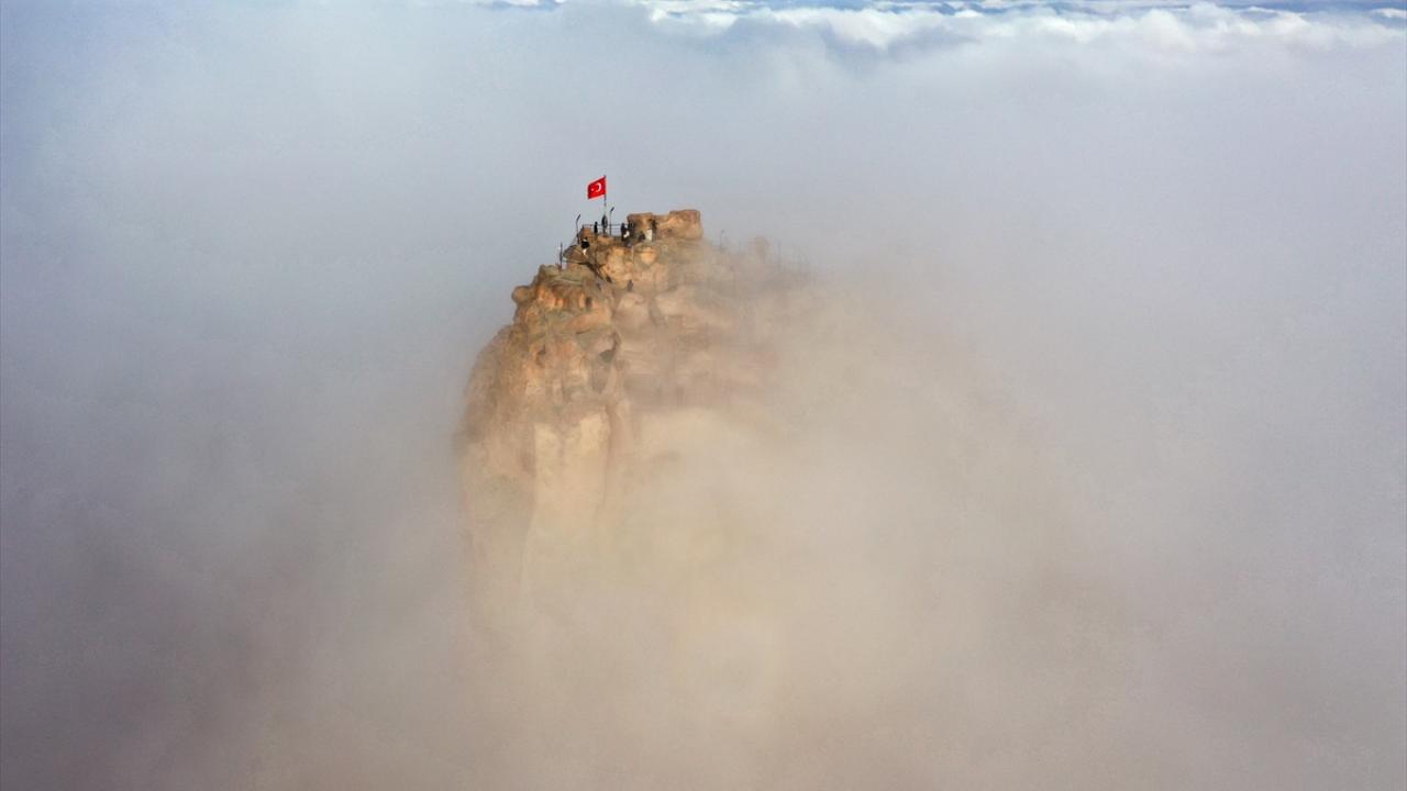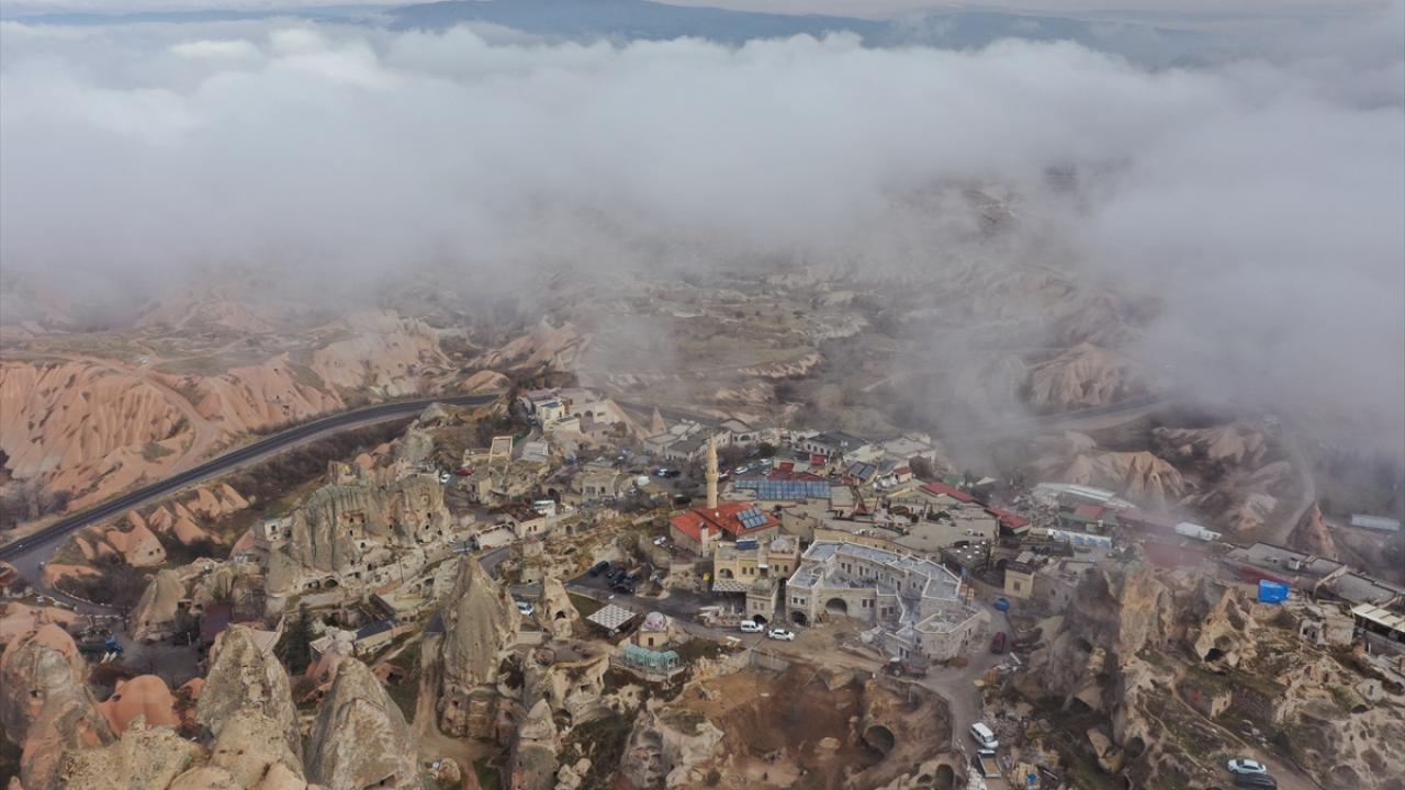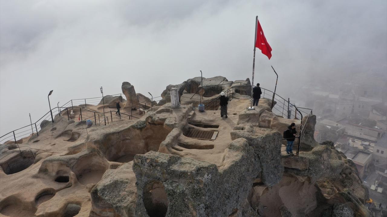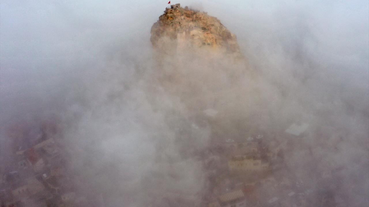 Peribacaları ve ilginç kaya oluşumlarıyla kaplı Kapadokya'yı ziyaret eden turistler, son günlerde sık sık sisle kaplanan manzarayı, bölgenin hakim noktası Uçhisar Kalesi'nden izliyor.
