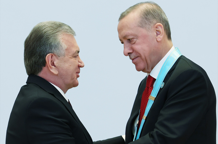 "Ebedi Şehir" Kongre Merkezi`nde düzenlenen törende Özbekistan Cumhurbaşkanı Şevket Mirziyoyev, "Türk Dünyası Ali Nişanı"nı Erdoğan`a takdim etti.
