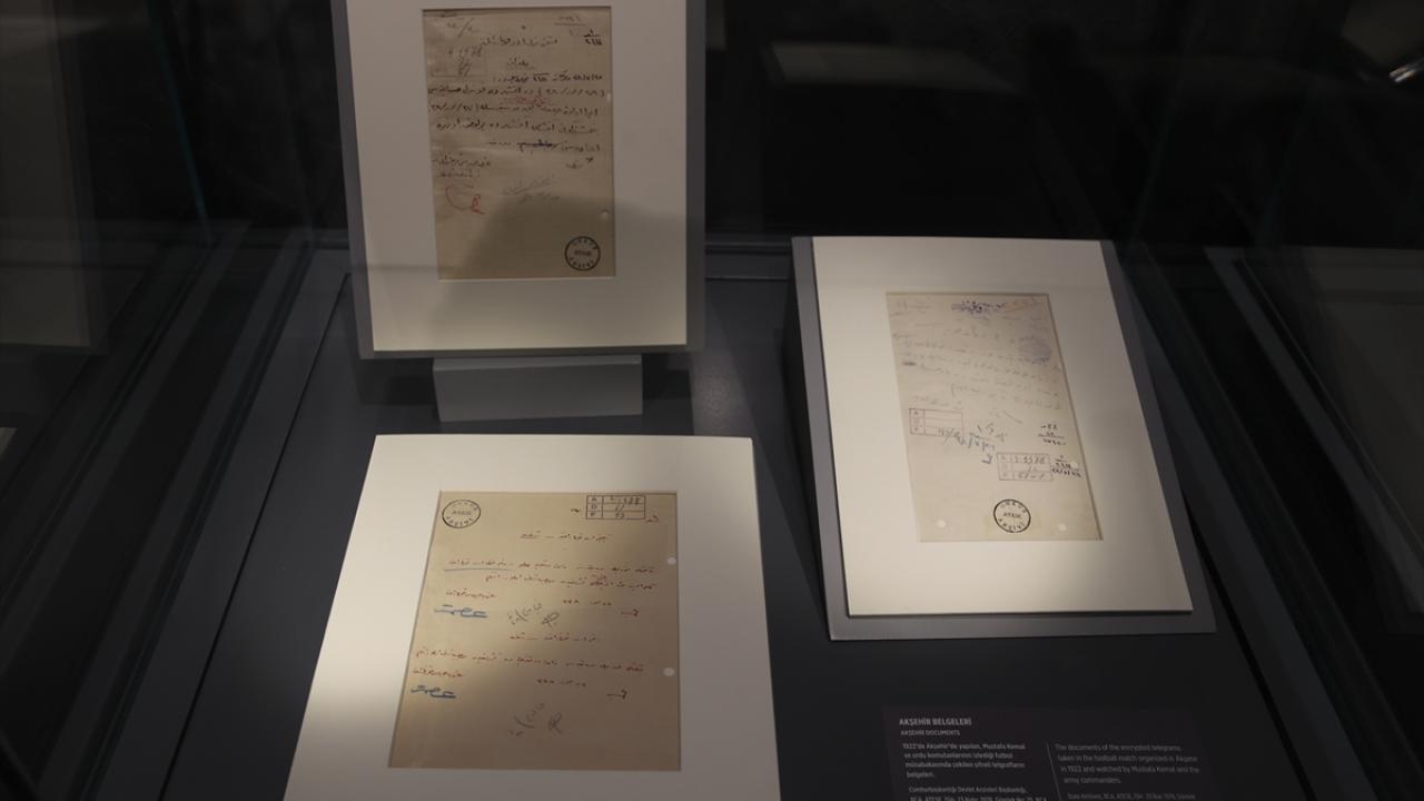 Mustafa Kemal Atatürk`ün Kurtuluş Savaşı sırasında ordu komutanlarıyla Büyük Taarruz`u planlamak için göstermelik olarak düzenlediği futbol maçına ilişkin "Akşehir Belgeleri", serginin en ilgi çekici bölümlerinden birini oluşturuyor. 1922`de Akşehir`de yapılan, Mustafa Kemal ve ordu komutanlarının izlediği futbol müsabakasında çekilen şifreli telgrafların belgeleri, ziyaretçilerin dikkatini çekiyor.