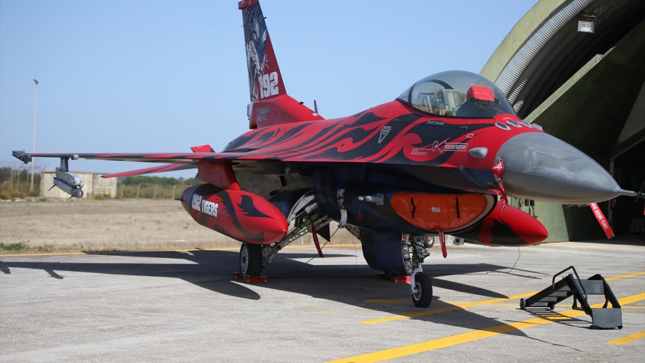 Kırmızı-siyah kaplan desenli boyamaya sahip F-16 ilgi odağı