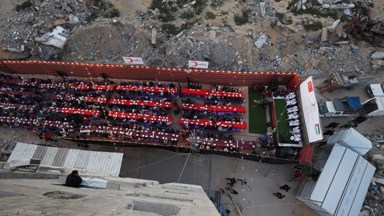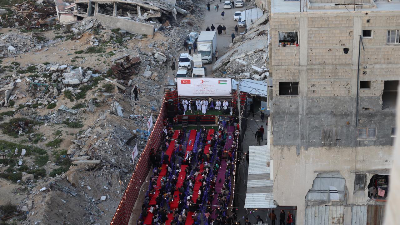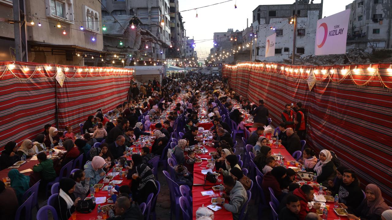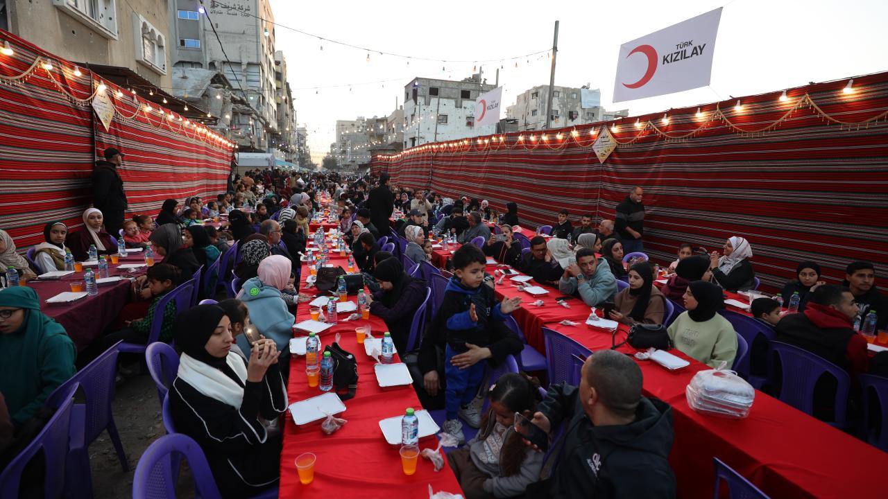 Türk Kızılay, ramazan ayında dayanışmayı artırmak amacıyla Gazze kentinin orta kesimindeki Yermuk bölgesinde yerinden edilen Filistinliler için toplu iftar programı düzenledi.