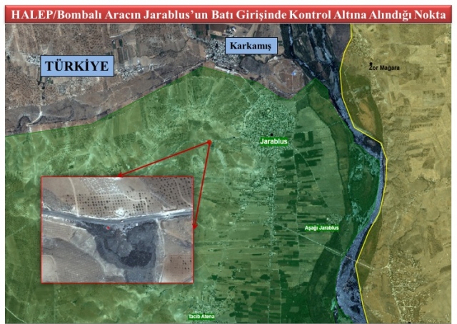 Fırat Kalkanı Harekatı’nı icra eden unsurlar, Cerablus’ta faaliyet gösteren Türk askeri konvoyunu hedef alan bomba yüklü aracı ele geçirdi.