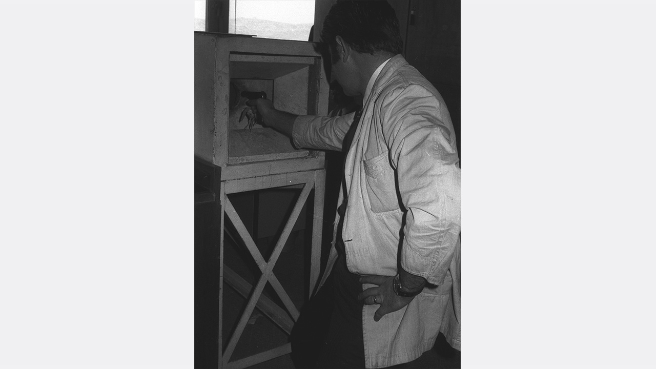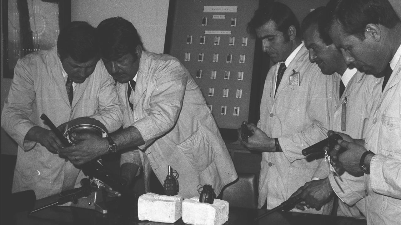 1970`li yıllarda polis kriminal laboratuvarlarında ölçüm için atış yapılıyor.