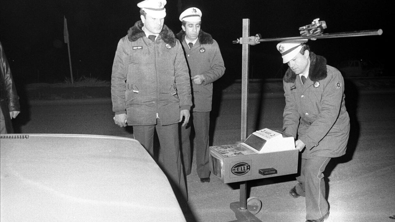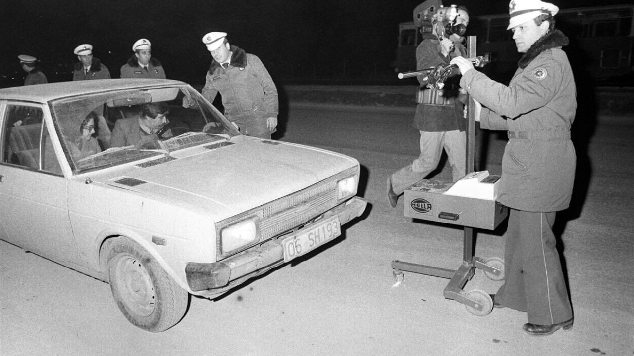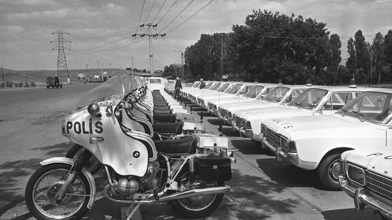 Temelleri 1845`te "Polis Nizamnamesi" ile atılan Türk Polis Teşkilatı, 330 bin 350 personeliyle kuruluşunun 177`nci yılını kutluyor. 1980`li yıllarda Ankara Bölge Trafik ekipleri denetimleri kapsamında far ayarı ölçümü yaparlarken görülüyor.