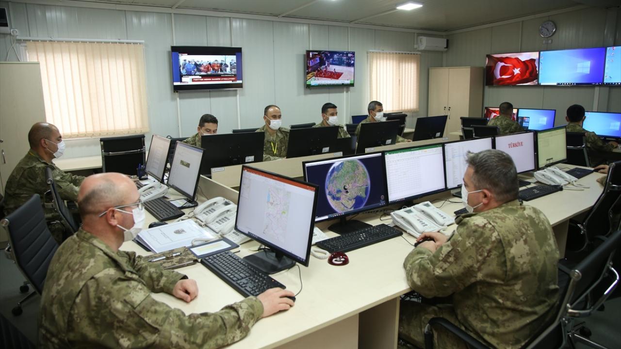Merkezde görevli askerler bölgeden insansız hava araçlarıyla (İHA) alınan görüntüleri birlikte izliyor, ateşkese uyulup uyulmadığını gözlemliyor.