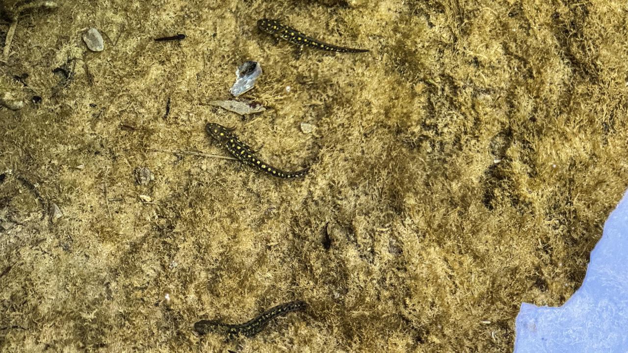 Su altında görüntülenen semenderlerden erişkin olanlarının siyah ve sarı benekli, yeni gelişmekte olanlarının gri tonlarda ve sarı beneklerinin belirgin olmadığı görülüyor.
