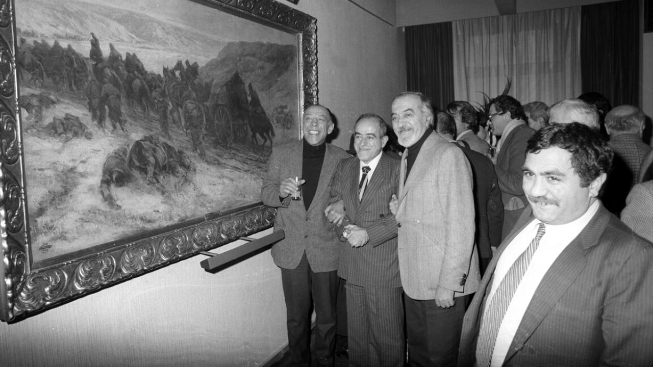 Kemal Sunal, Tarık Akan, Emel Sayın, Zeki Alasya, Metin Akpınar, Münir Özkul ve Halit Akçatepe, 1974 yapımı Mavi Boncuk filminin setinde. (Arşiv)