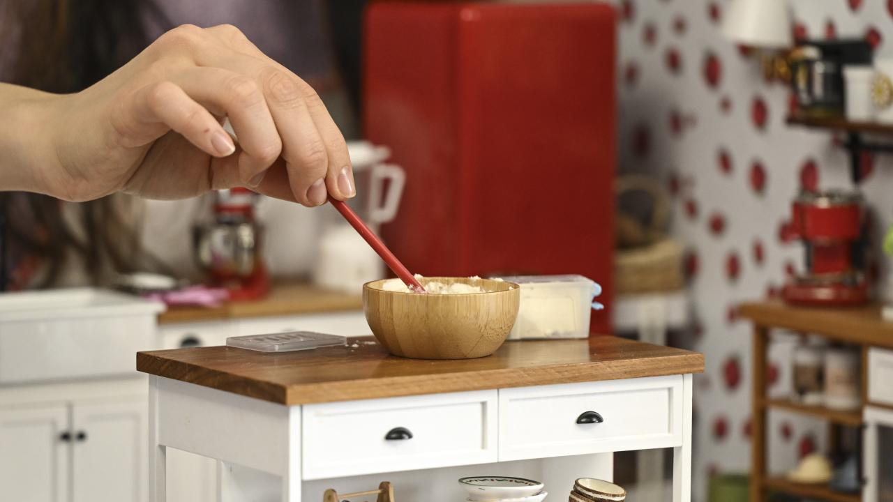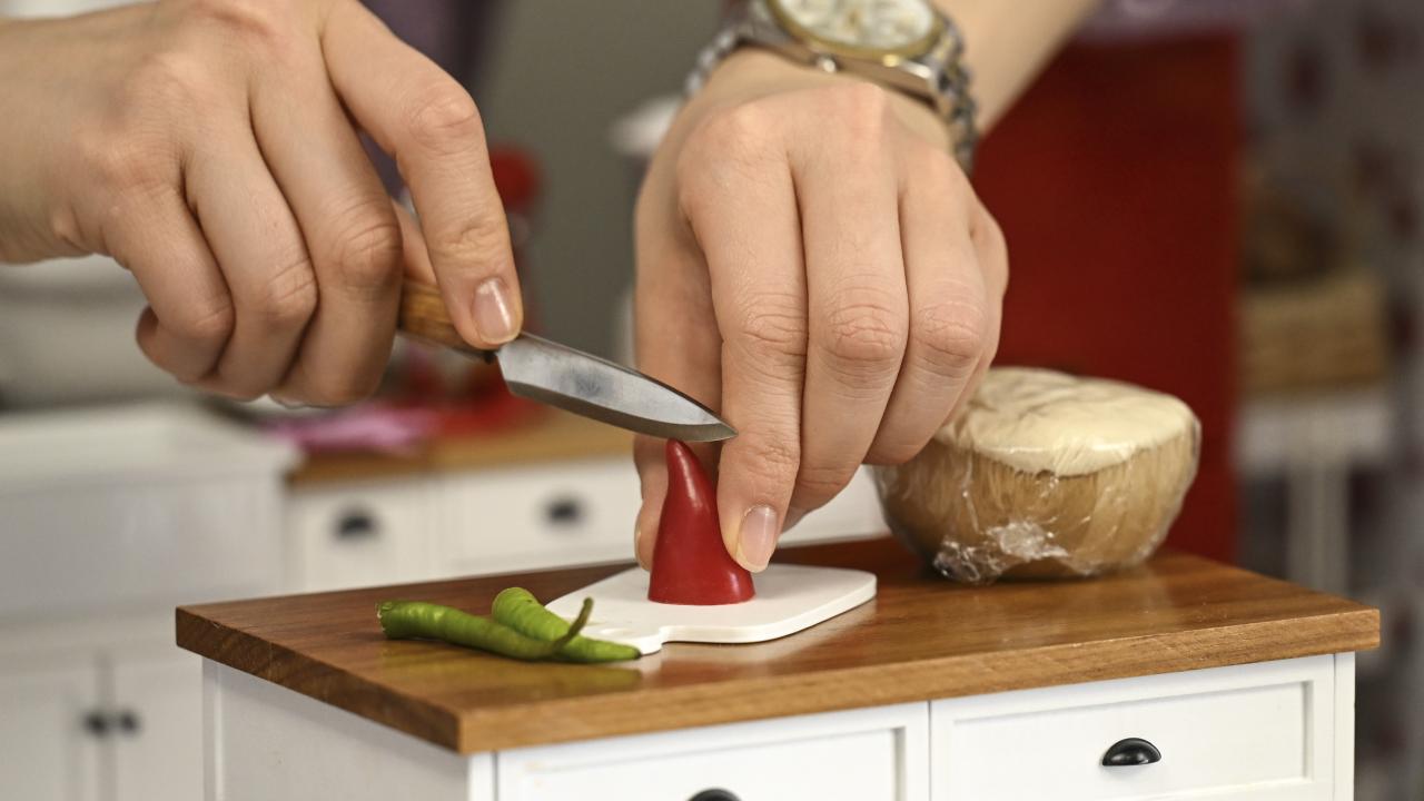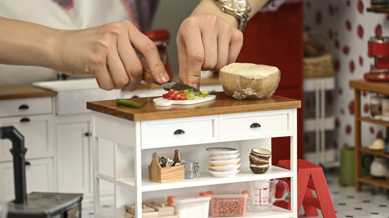 Yemeklerini kurduğu sosyal medya hesabında paylaşan Ünveren, küçük sebze ve meyveleri minik tahtalarda doğrayıp pişiriyor, hamurunu mini oklavayla açıyor.