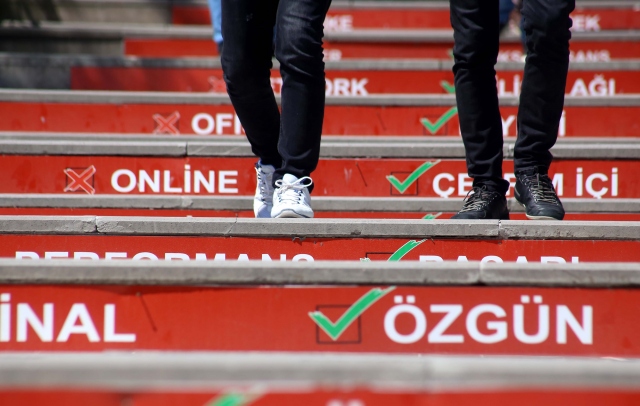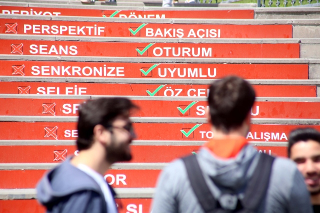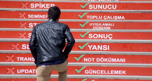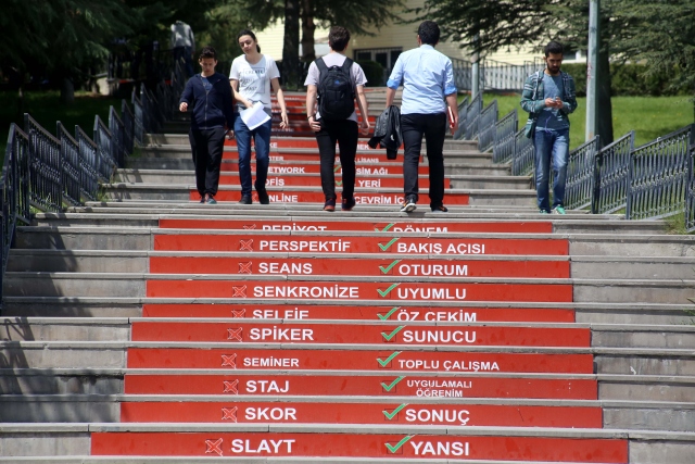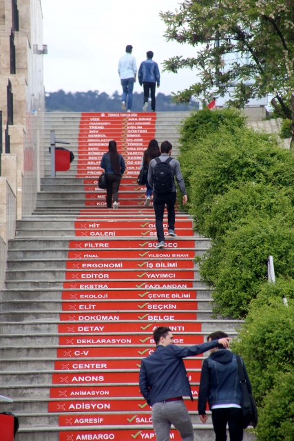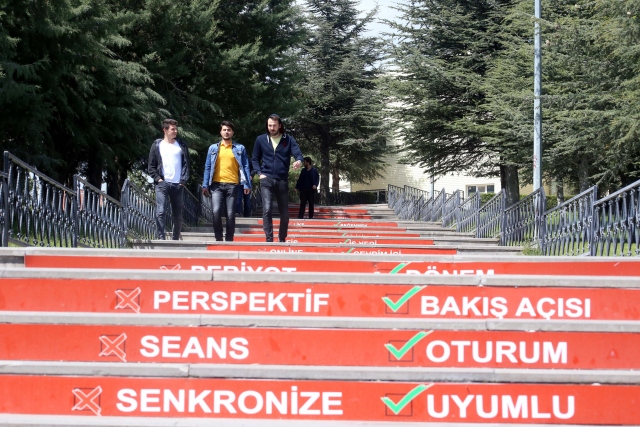 Süleyman Demirel Üniversitesi (SDÜ) Türkçe Topluluğunun geliştirdiği "Adım Adım Türkçe Projesi" kapsamında, öğrencilerin yoğun olarak kullandığı merdivenlere yabancı kökenli sözcükler ve Türkçe karşılıkları yazıldı.