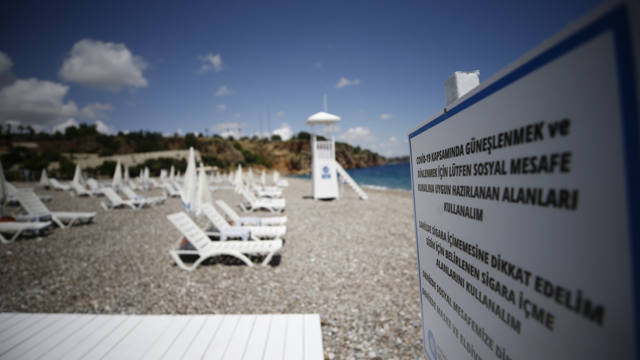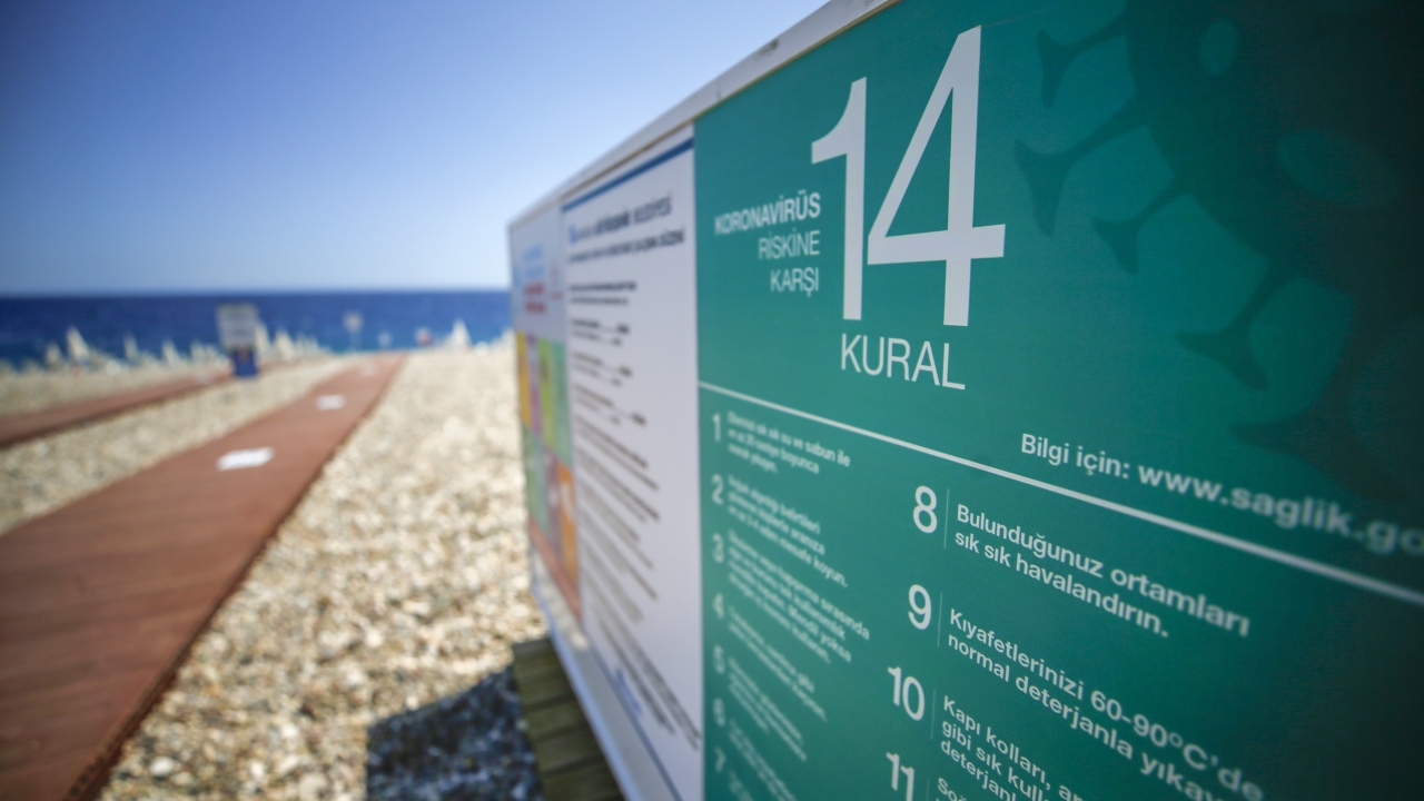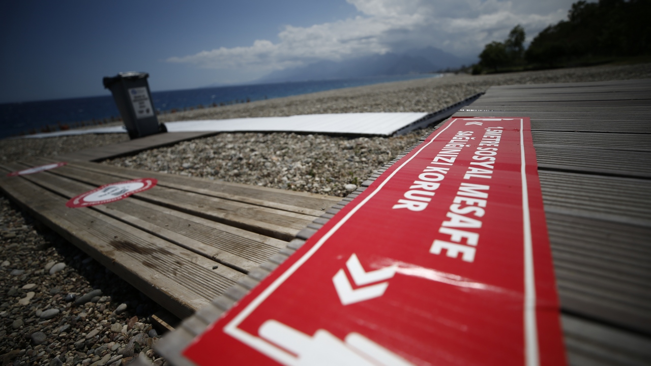 Plajlara sosyal mesafe uyarısı yapan yazılar yerleştirildi.