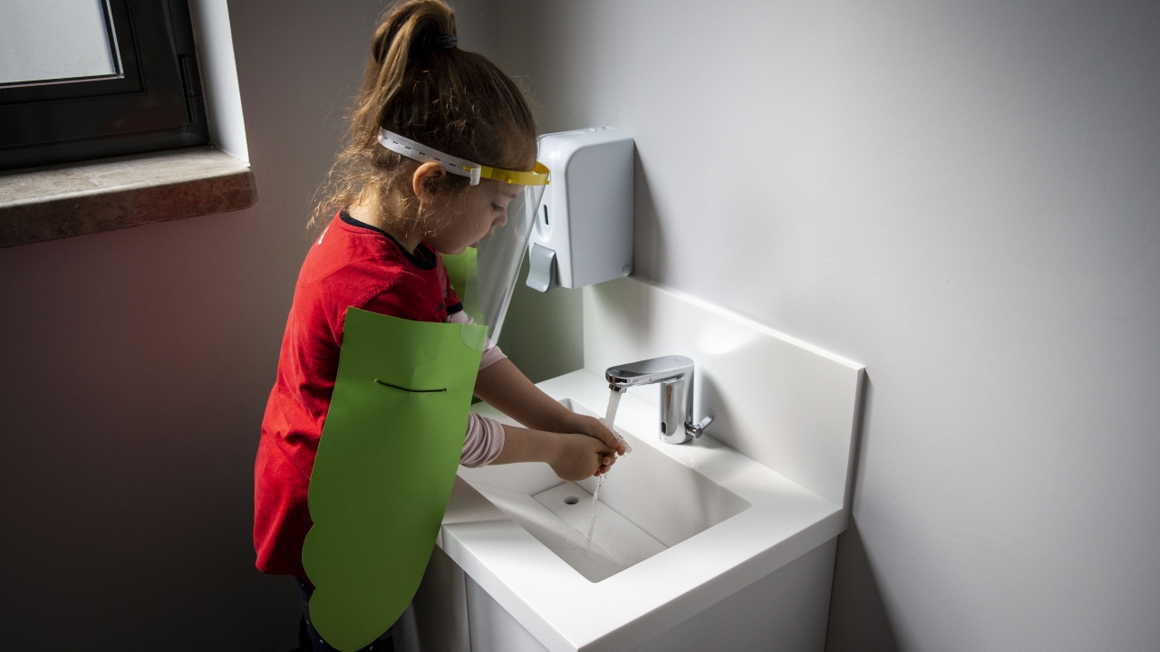 Kurum girişlerinde ateşi ölçülen ve ellerine dezenfektan uygulanan miniklerin temizliğe özen göstermesine de dikkat ediliyor.
