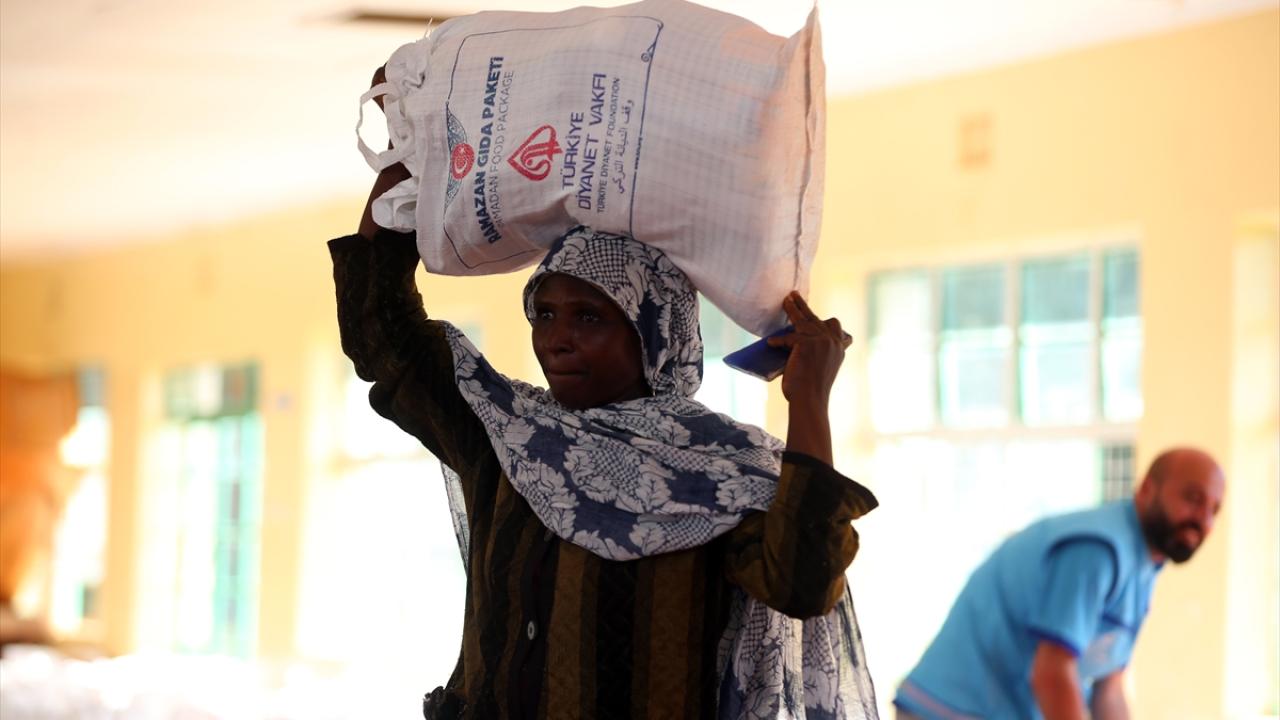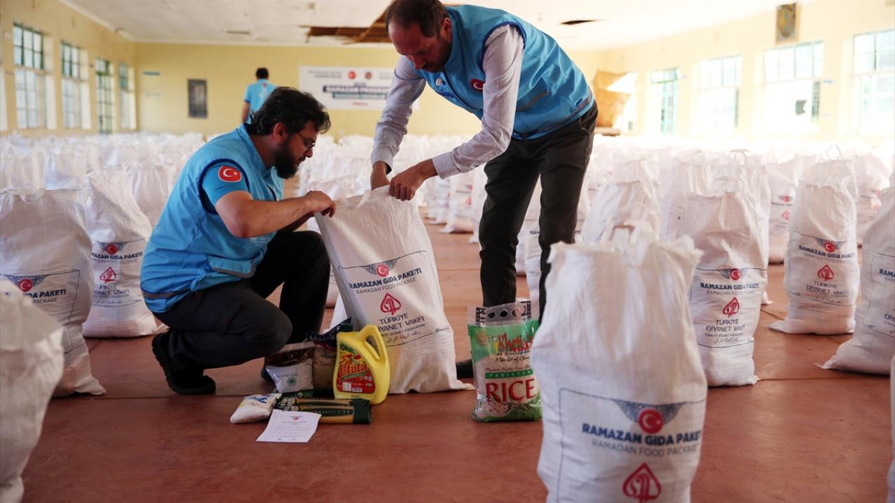 İçinde pirinç, şeker, sıvı yağ, makarna, fasulye, un ve tuz bulunan paketler, TDV yetkililerince bölgedeki bir tesiste 450 aileye teslim edildi.