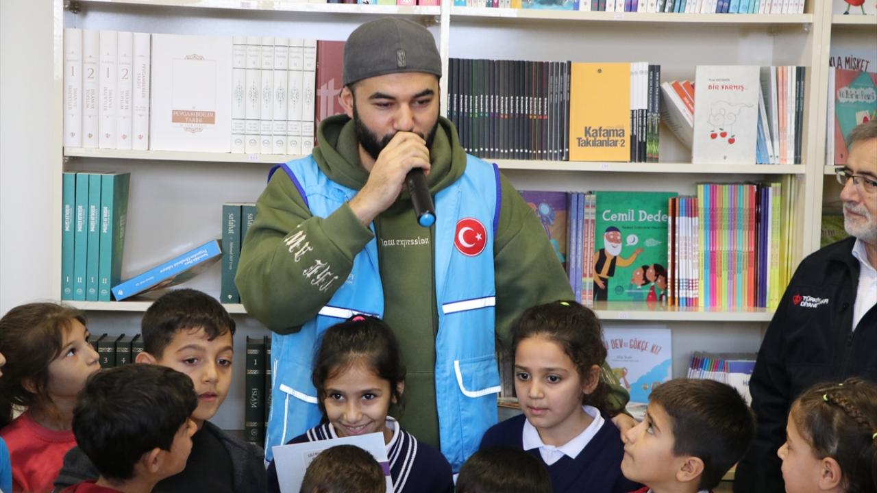 Kitap dağıtımı sonrası rap müziği sanatçısı Resul Aydemir, öğrencilere şarkı söyledi.