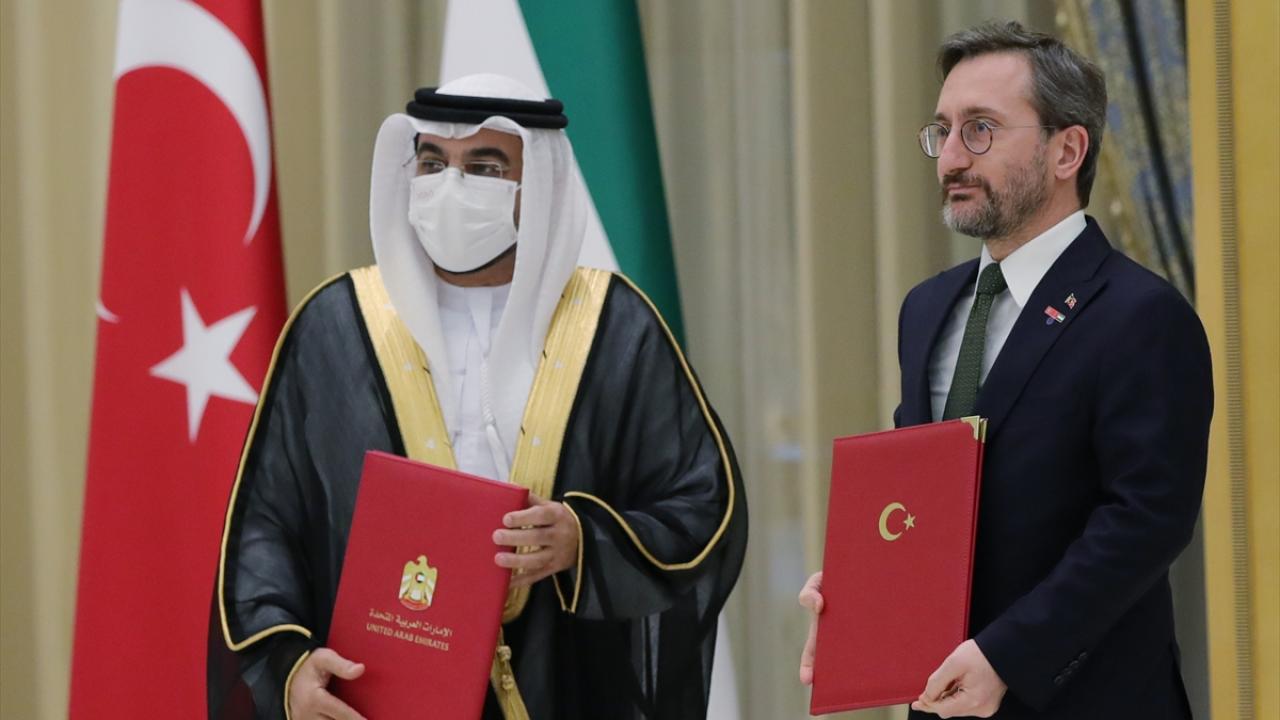 Türkiye Cumhuriyeti Hükümeti ile BAE Arasında Medya ve İletişim Alanlarında İş Birliği Protokolü, Cumhurbaşkanlığı İletişim Başkanı Fahrettin Altun ve BAE Hükümet Ofisi Başkanı Saeed Al Eter tarafından imza altına alındı.