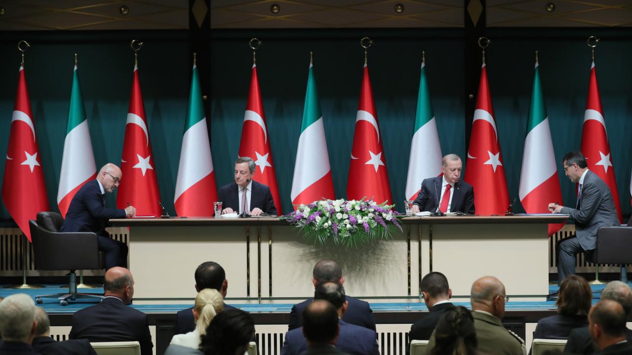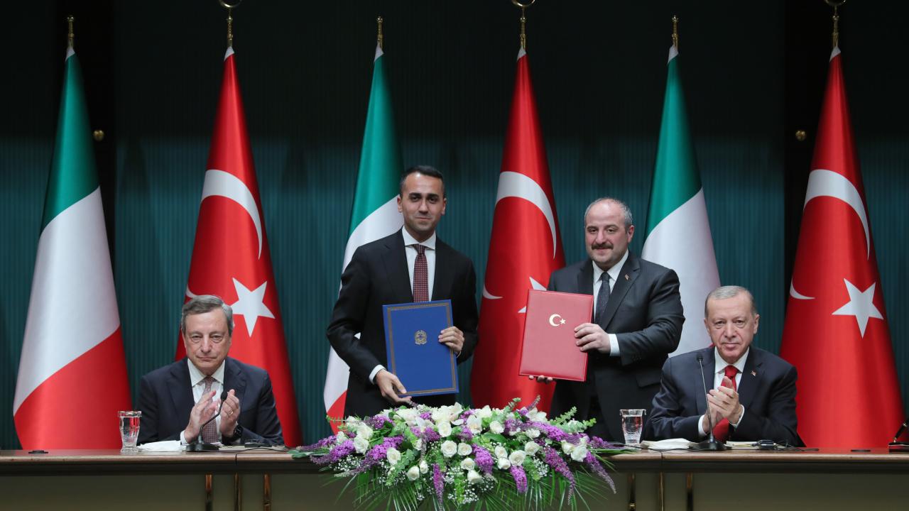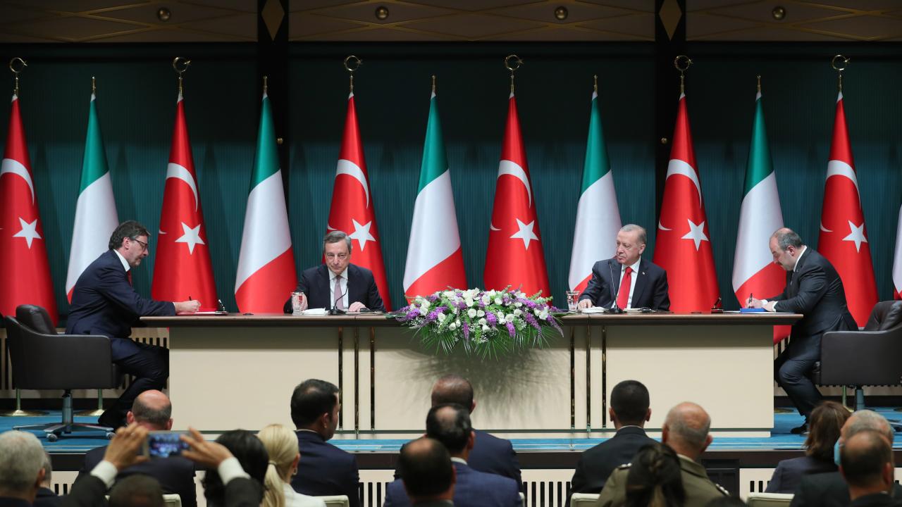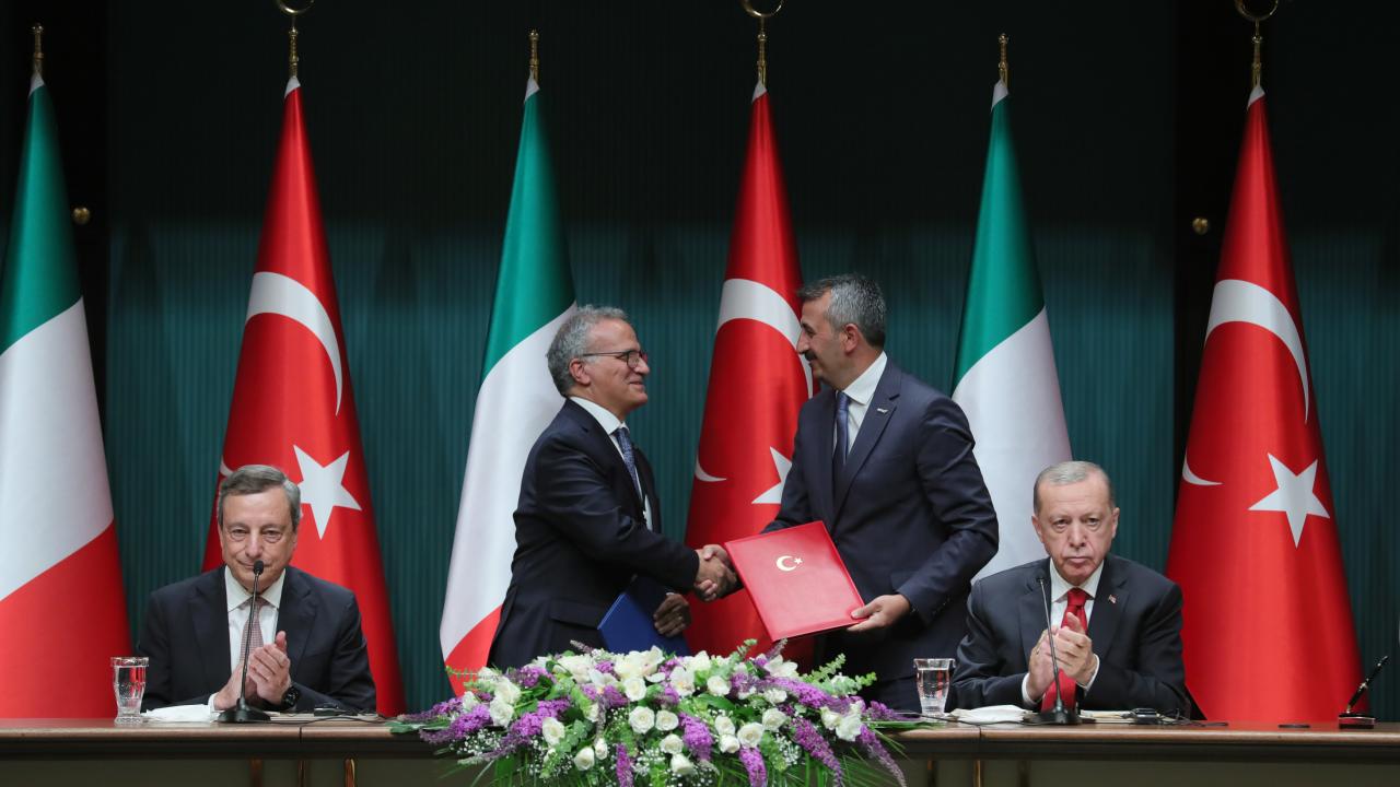 Cumhurbaşkanı Recep Tayyip Erdoğan ve Cumhurbaşkanlığı Külliyesi'nde İtalya Başbakanı Mario Draghi'nin başkanlığındaki baş başa ve hükümetler arası görüşmelerin ardından, iki ülke arasındaki anlaşmaların imza törenine geçildi.