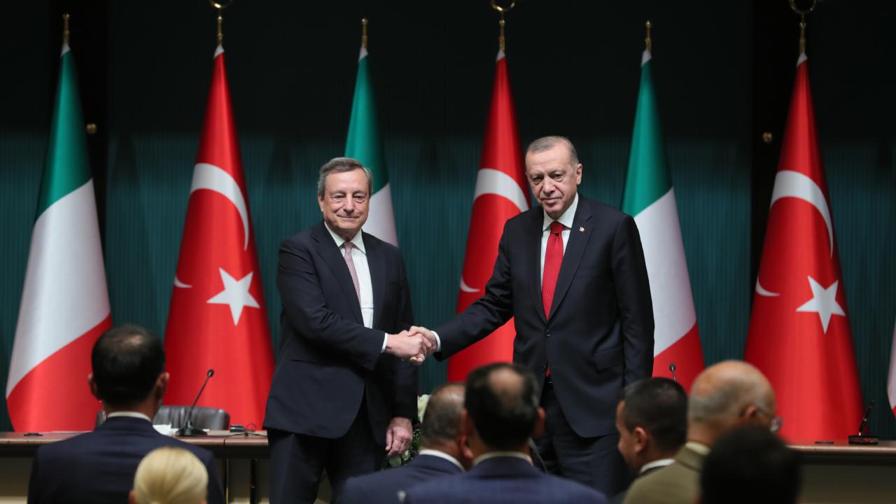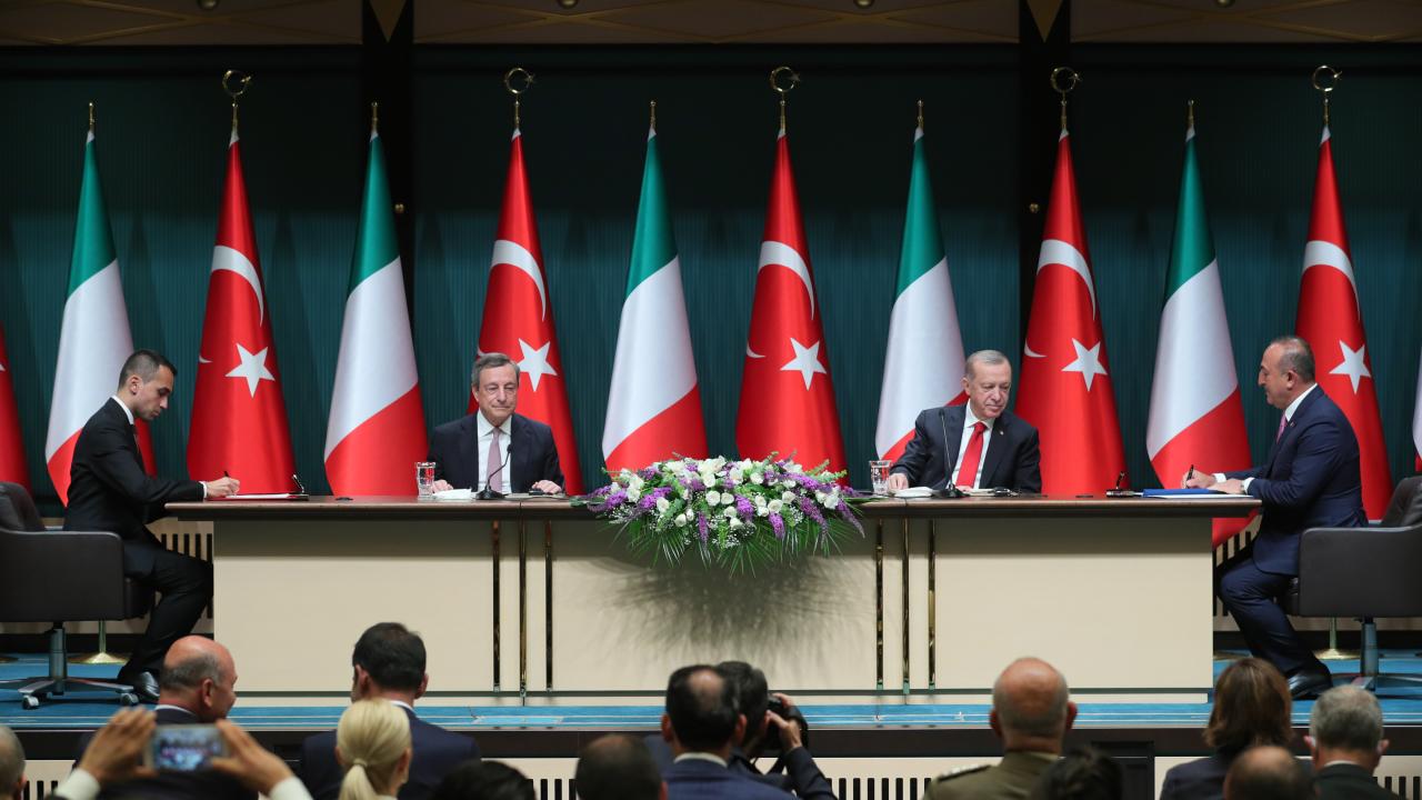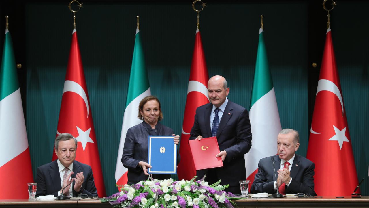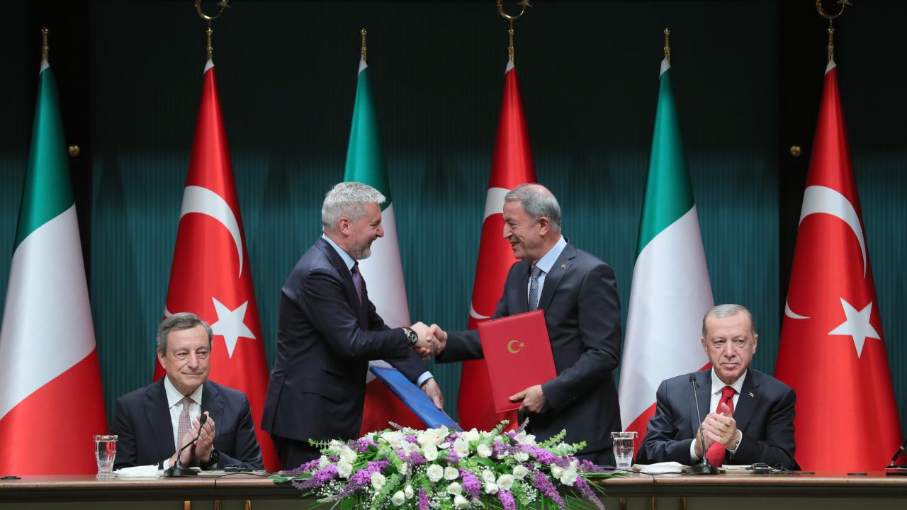 Cumhurbaşkanı Recep Tayyip Erdoğan ve Cumhurbaşkanlığı Külliyesi'nde İtalya Başbakanı Mario Draghi'nin başkanlığındaki baş başa ve hükümetler arası görüşmelerin ardından, iki ülke arasındaki anlaşmaların imza törenine geçildi.