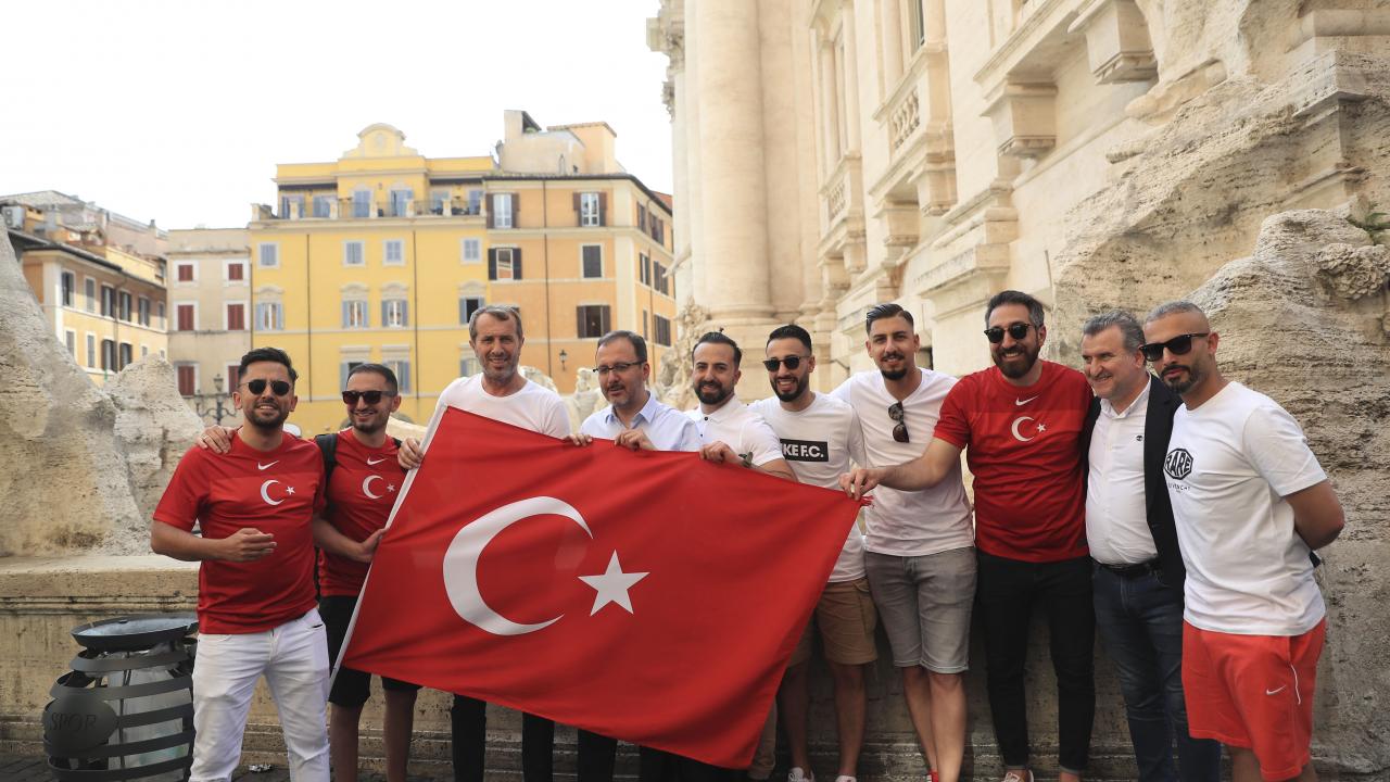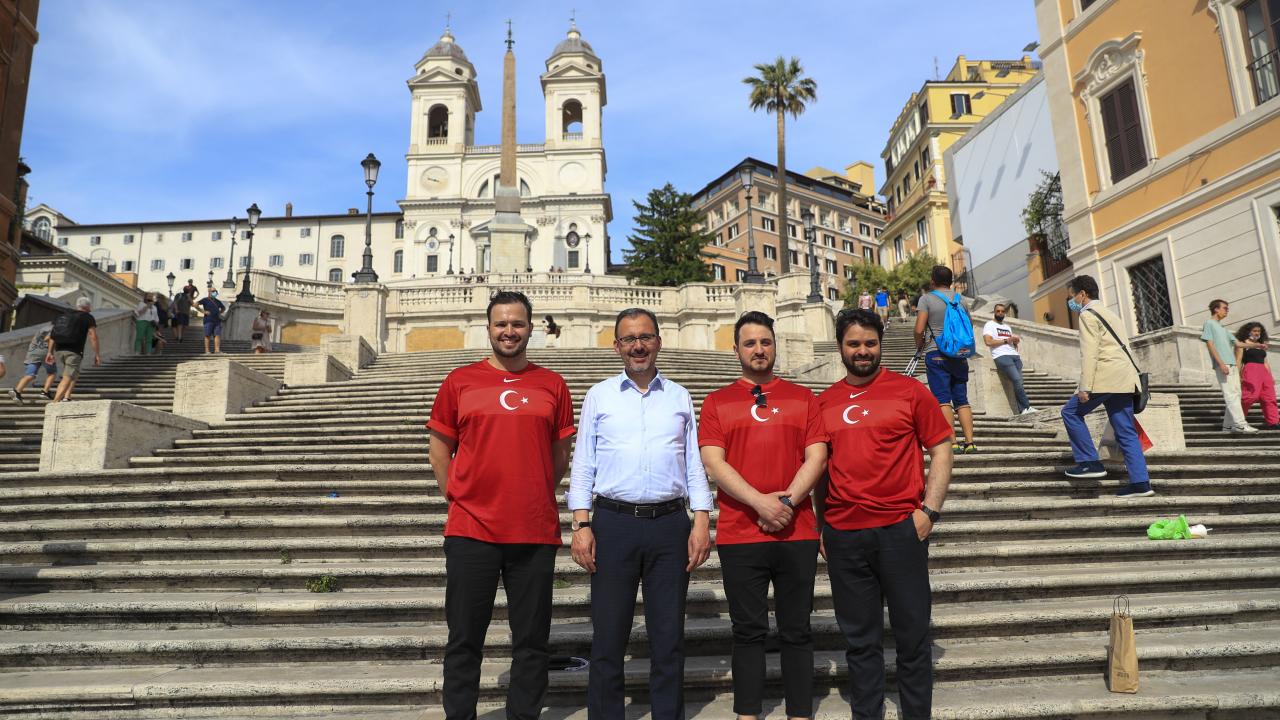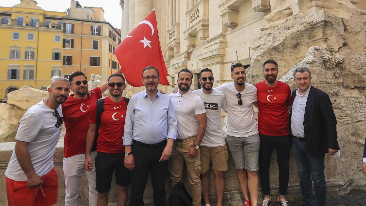 Türkiye-İtalya maçını izlemek üzere Roma`ya gelen Gençlik ve Spor Bakanı Mehmet Muharrem Kasapoğlu, maç öncesi Roma`da A Milli Futbol Takımı`na destek veren Türk taraftarlarla bir araya geldi.