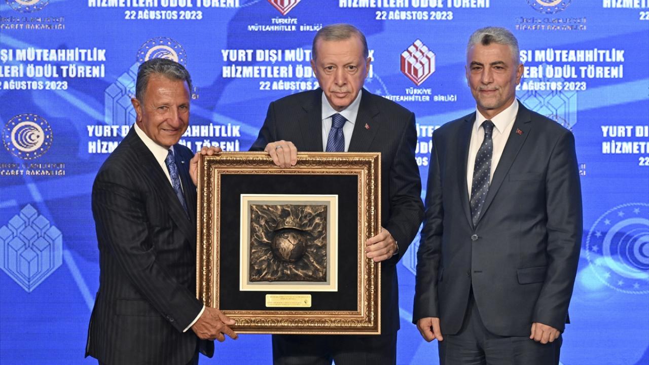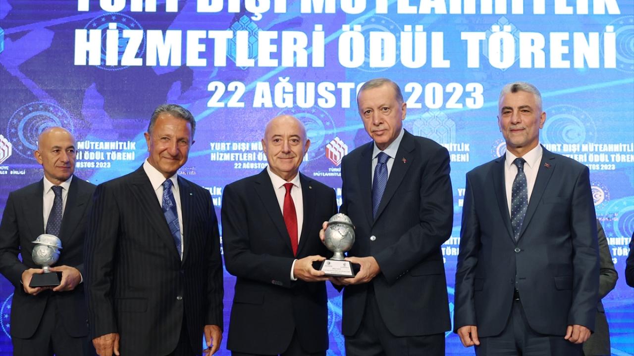 Erdoğan, burada ödül sahiplerine ödüllerini takdim etti. Törende Ticaret Bakanı Ömer Bolat da (sağda) yer aldı.
