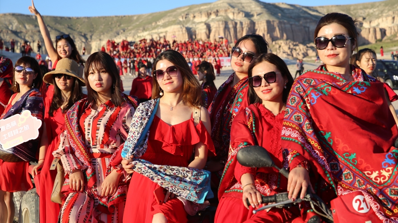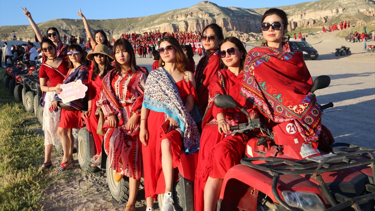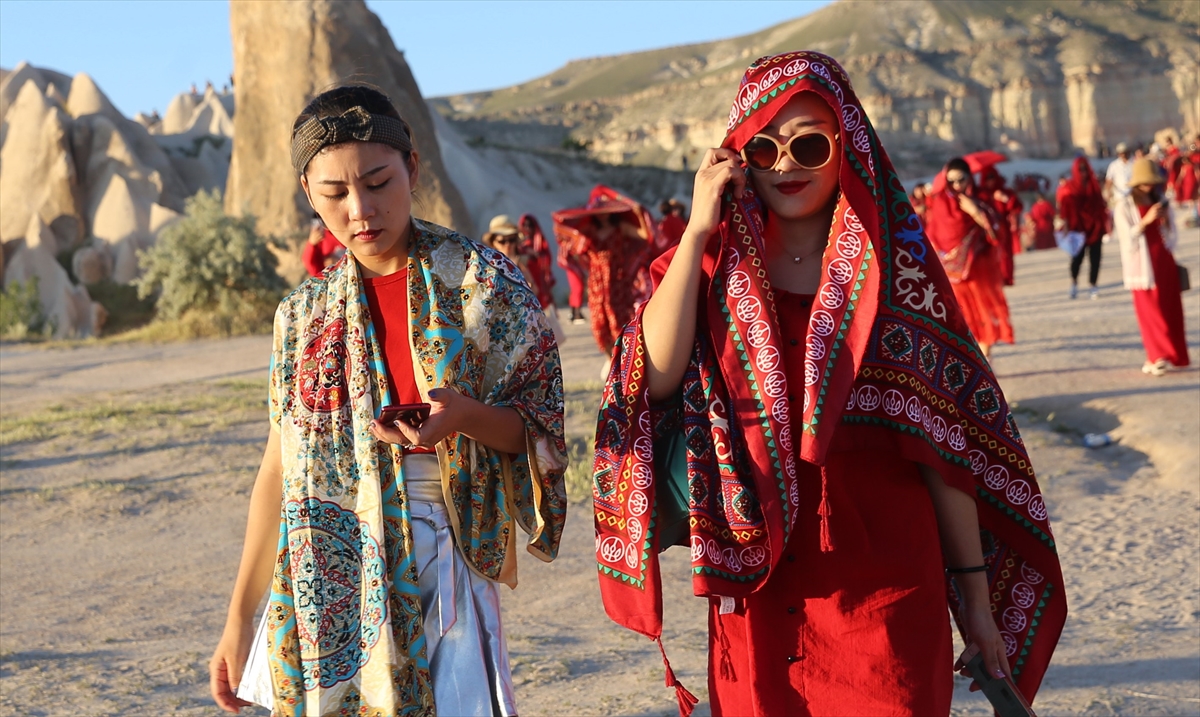 Çin'de bir kozmetik firması tarafından, başarıları dolayısıyla Türkiye tatili ile ödüllendirilen bin kadın Kapadokya'da yöresel kıyafetleriyle gezdikleri peribacaları arasında renkli görüntü sergiledi.
