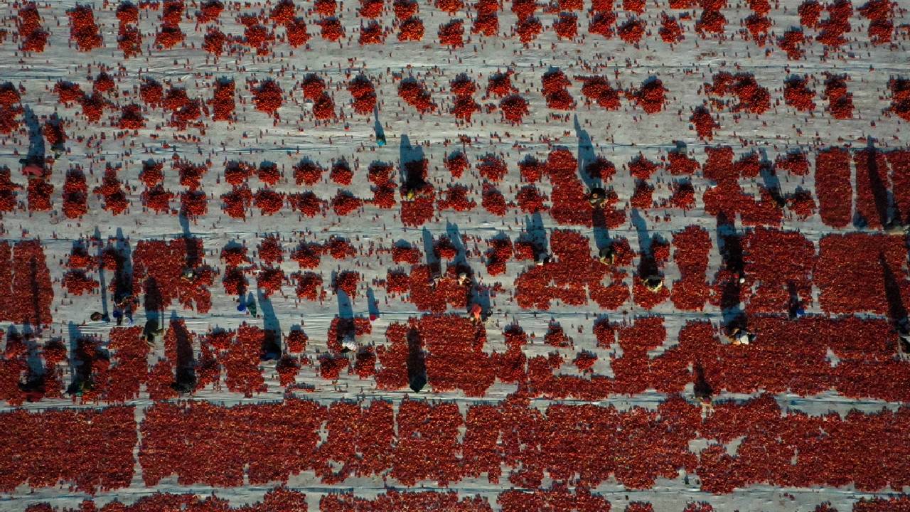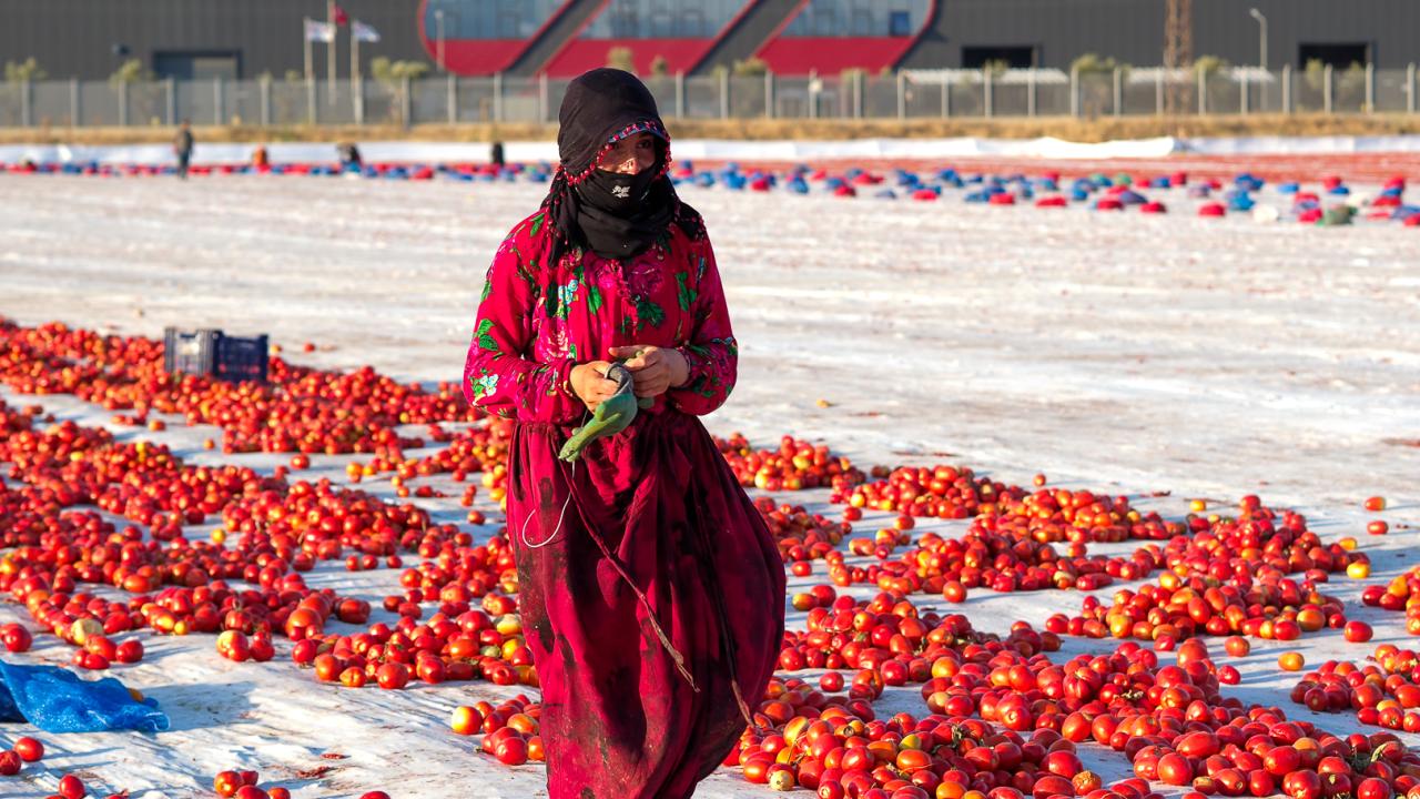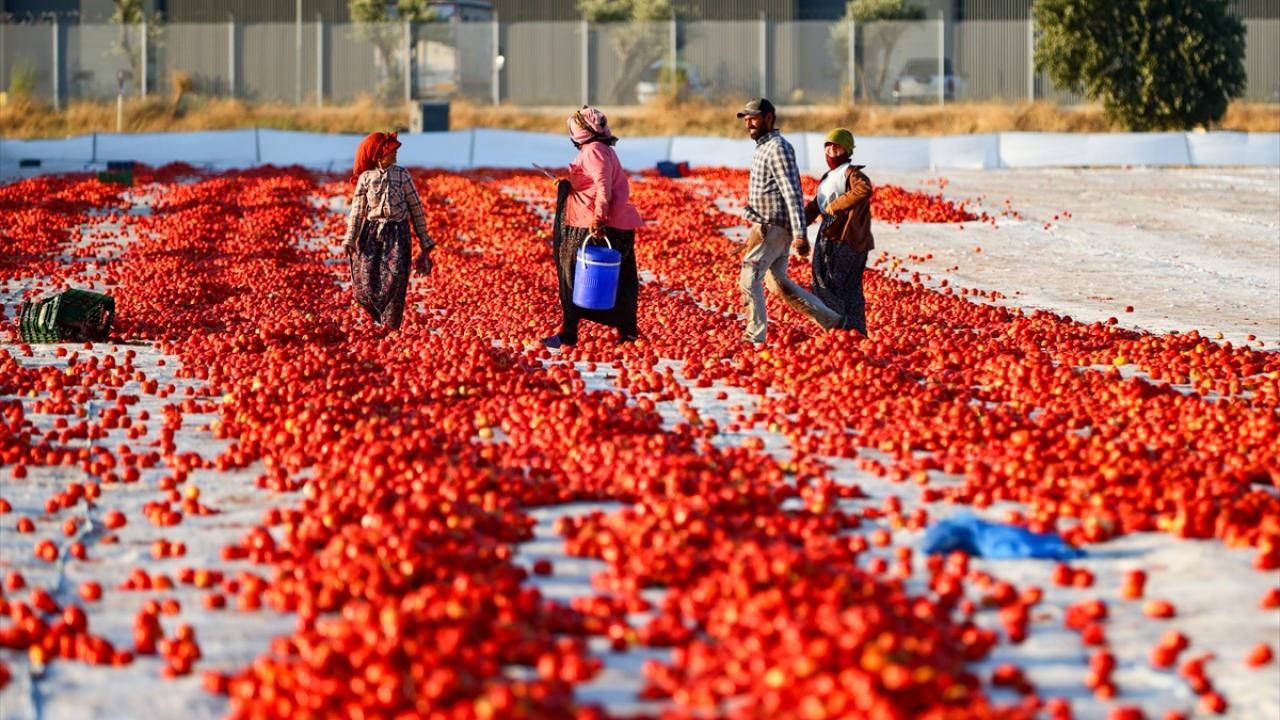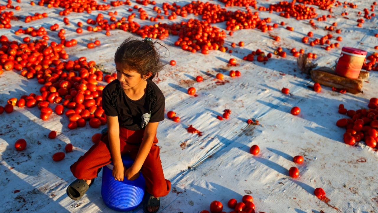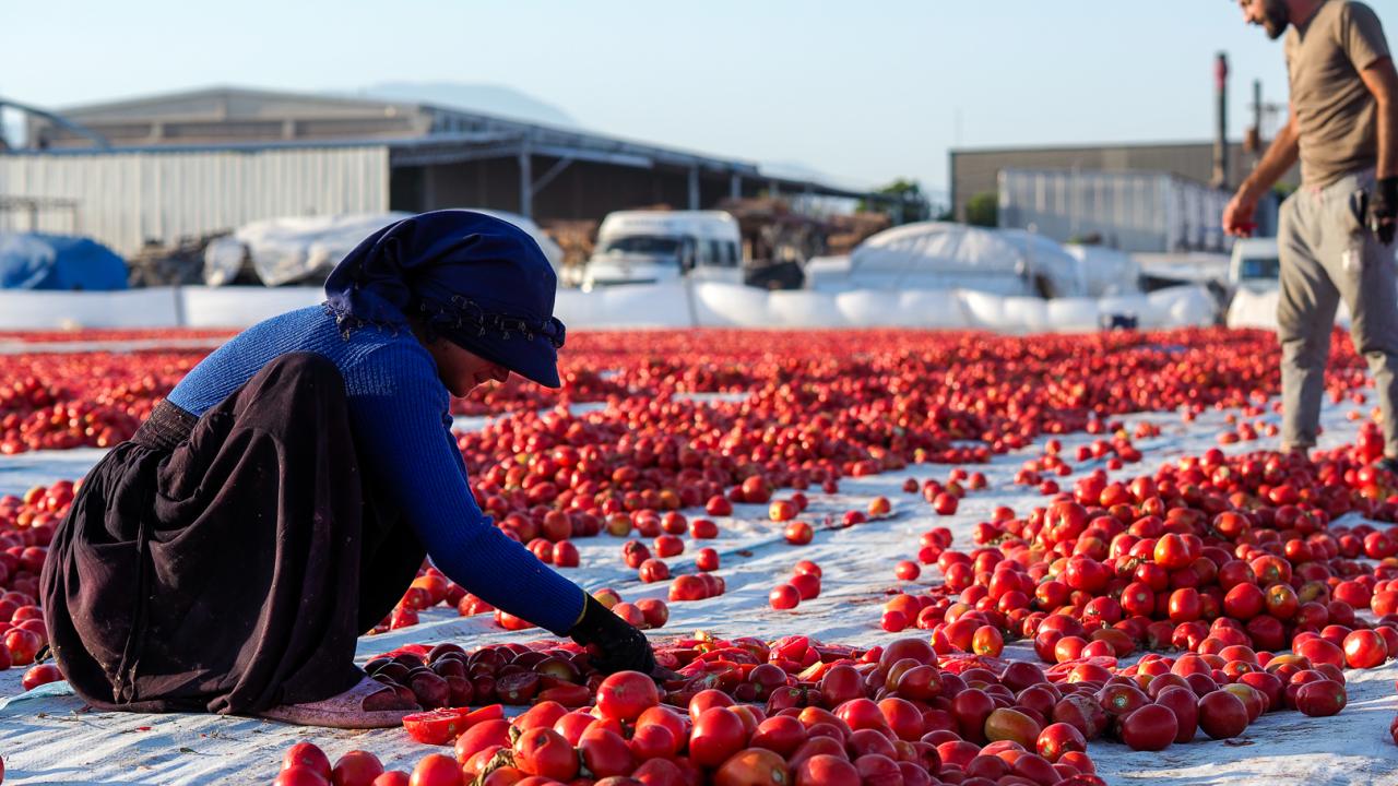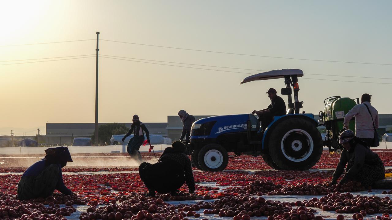 Gün doğumuyla kaldıkları çadırlardan çıkarak çalışmaya başlayan işçiler, toprak zemin üstüne serilmiş beyaz örtüyle kaplı alana giriş yapıyor. Kavurucu güneşin altında zamanla yarışan işçilerden her biri günlük yaklaşık 150 kasalık domates kesiyor.