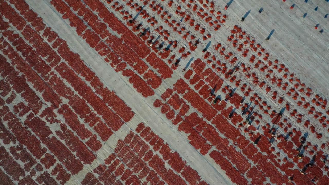 Sergi alanlarını kırmızıya bürüyen domatesler, kükürt veya tuz atılarak bir hafta güneş altında bekletilerek kurutuluyor.