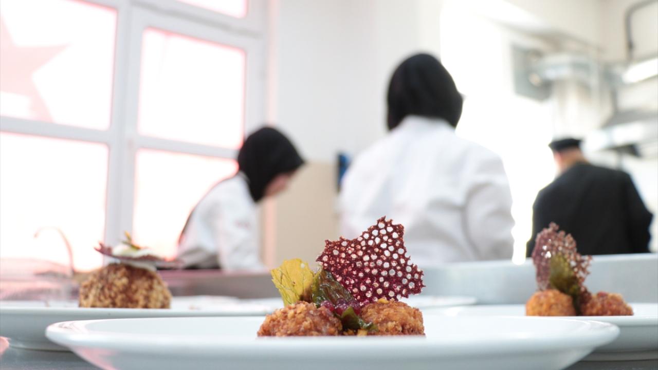 Görsel estetiğe önem vererek oluşturdukları tabakları jüri önüne koyan öğrenciler hem yemeklerin hazırlanma aşamasını anlattı hem de tatmaları için üyelere servis etti.