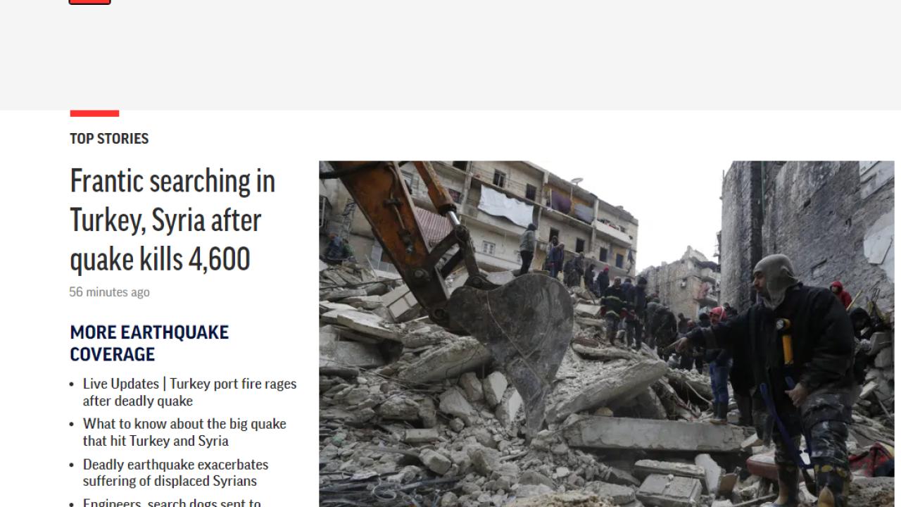 Türkiye'de merkez üssü Kahramanmaraş'ın Pazarcık ilçesi olan 7,7 büyüklüğünde, öğleden sonra ise merkez üssü Elbistan olan 7,6 büyüklüğünde deprem meydana geldi. Enkaz altında kurtarma çalışmaları sürerken yaşanan depremler dünya basınında geniş yankı uyandırdı.