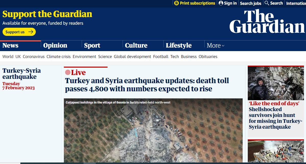 ABD`den yayın yapan The Guardian gazetesi: Türkiye ve Suriye`de deprem: 4 bin 800 kişi hayatını kaybetti. Rakamların yükselmesi bekleniyor.