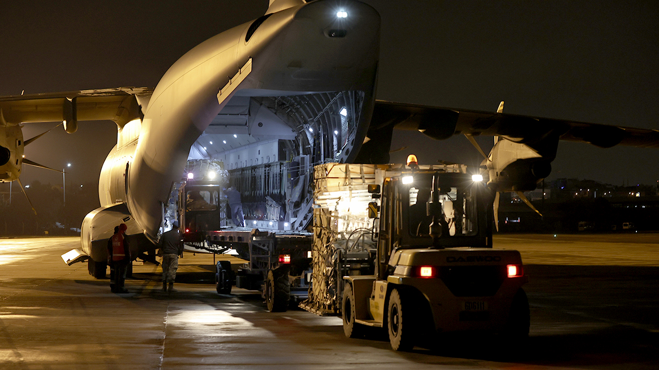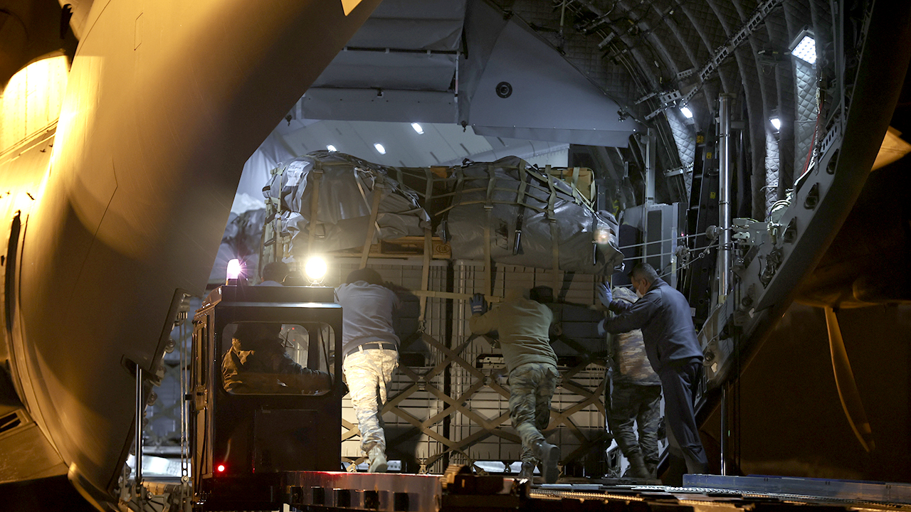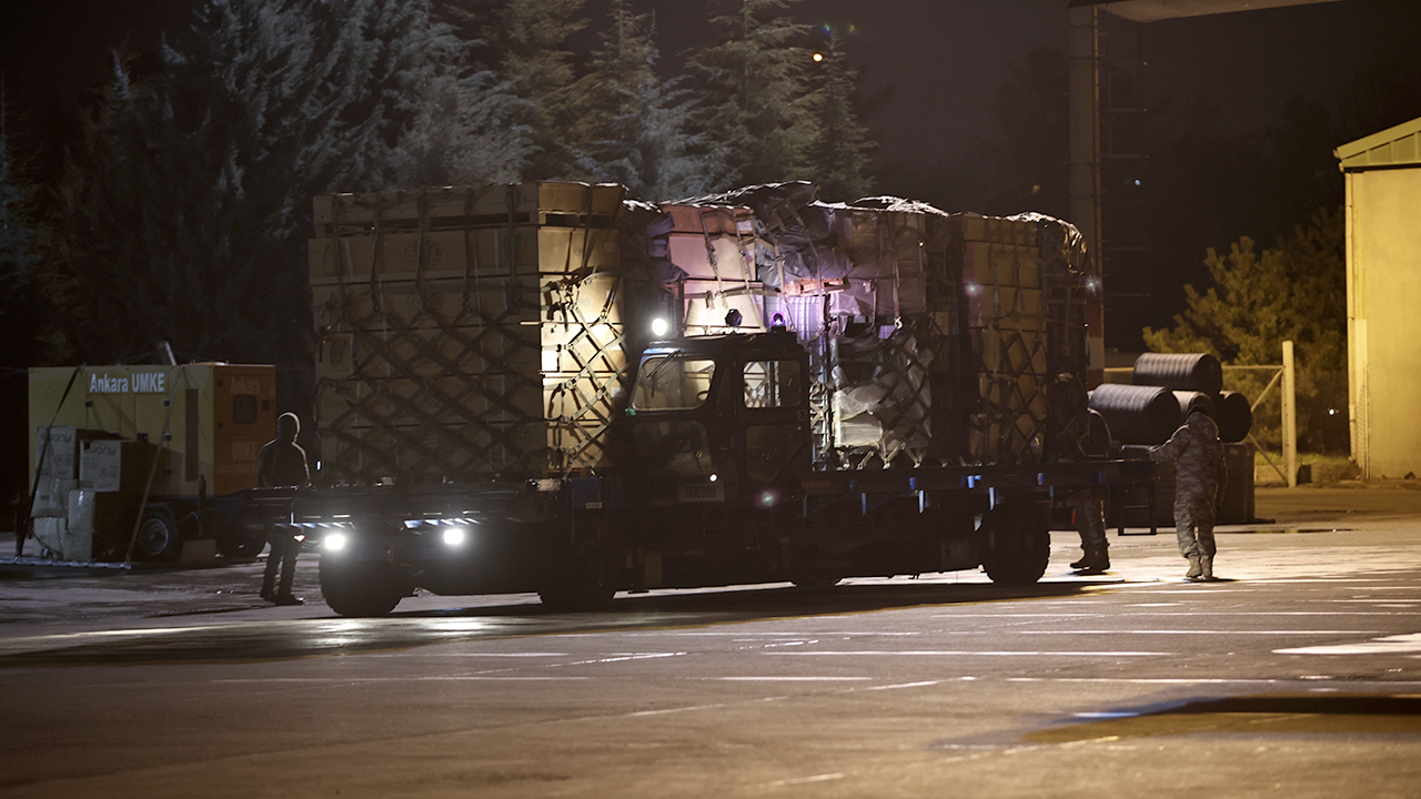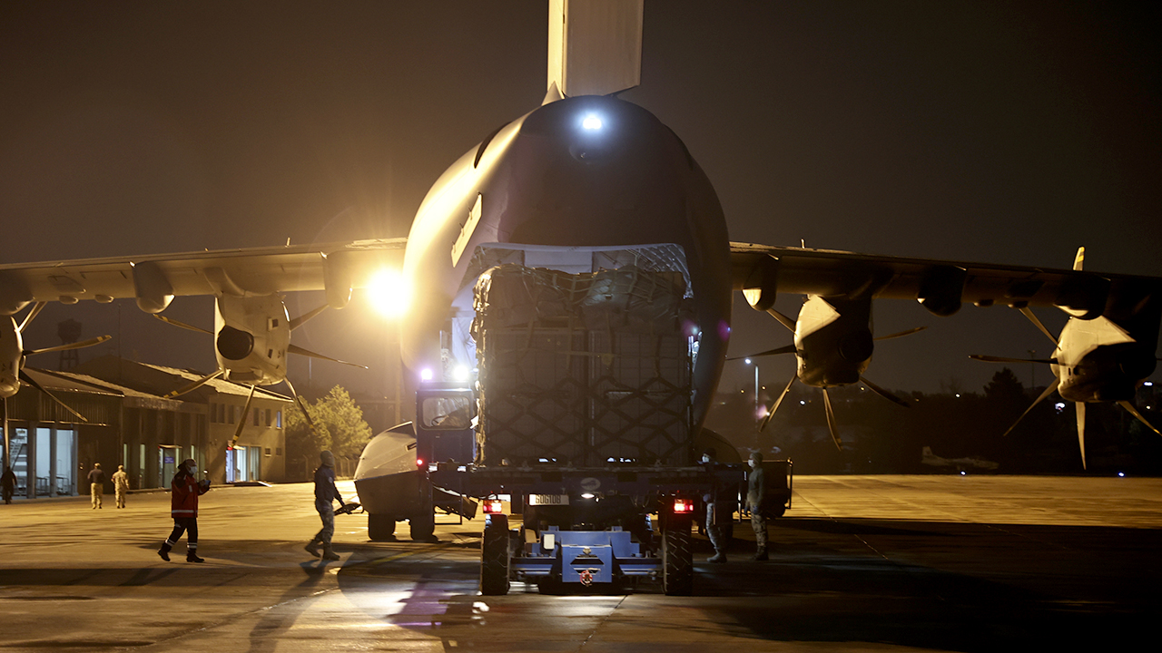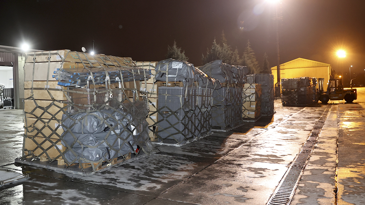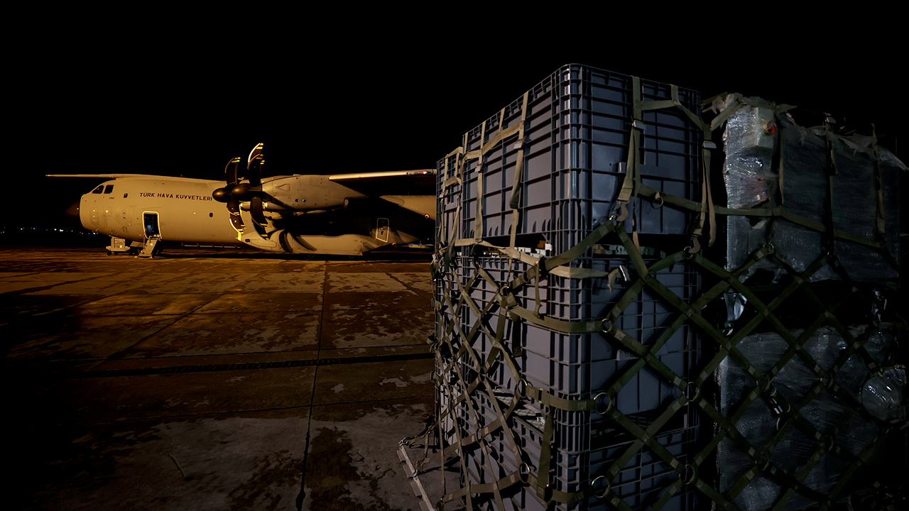 Bu kapsamda sağlık malzemeleri ile yangında zarar gören Türk Sahra Hastanesi`nin tekrar hizmete girmesi için hazırlanan Ağır İklim Tipi Sahra Hastanesi, Etimesgut Askeri Havaalanı`nda A 400M tipi askeri kargo uçağına yüklendi.