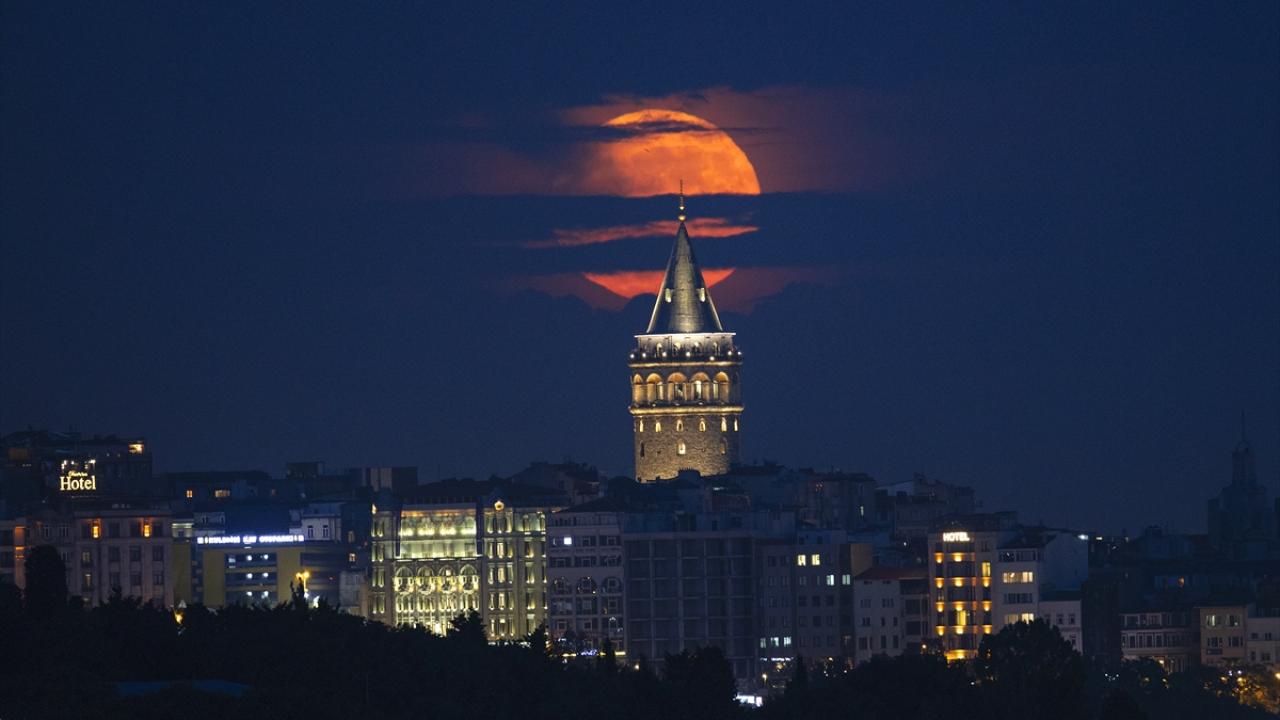 "Süper Ay" İstanbul`da Galata Kulesi ile güzel görüntü oluşturdu.