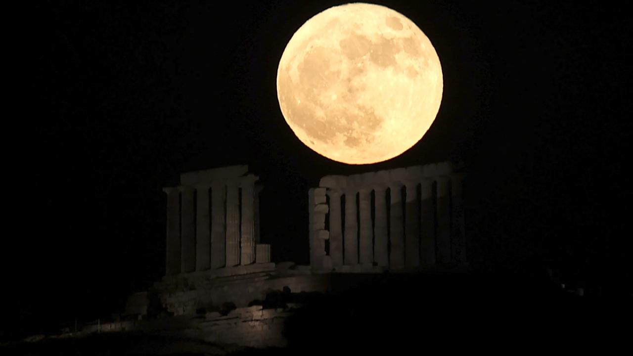Yunanistan’ın başkenti Atina yakınlarındaki Sounio bölgesinde bulunan Poseidon Tapınağı üzerinde yükselen `Çilek ayı` olarak bilinen Haziran dolunayı güzel görüntüler oluşturdu.