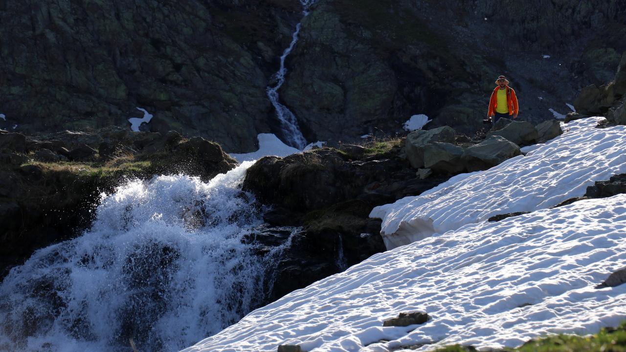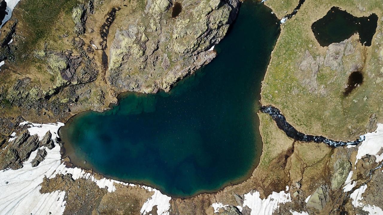 2 bin 720 metre rakımdaki Büyük Gölden sonra yoğun kar örtüsü üzerinden yürüyerek 2 bin 890 metre rakımdaki Adalı Göle geçen ekip yol üzerinde yanlarındaki poşetin üzerine oturup haziran ayının son günlerinde kar üzerinde kaydı.