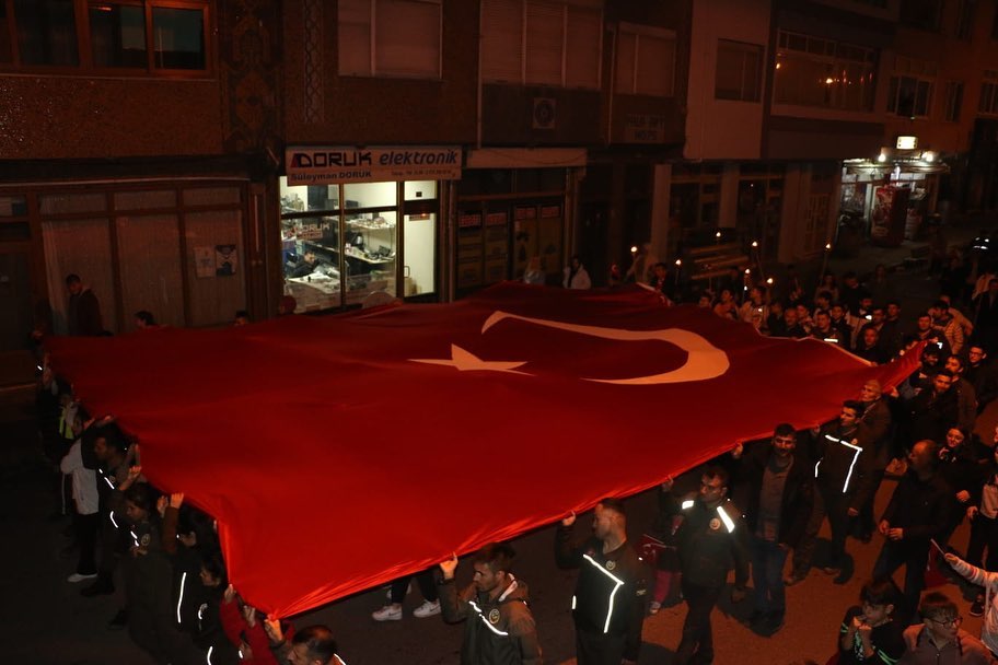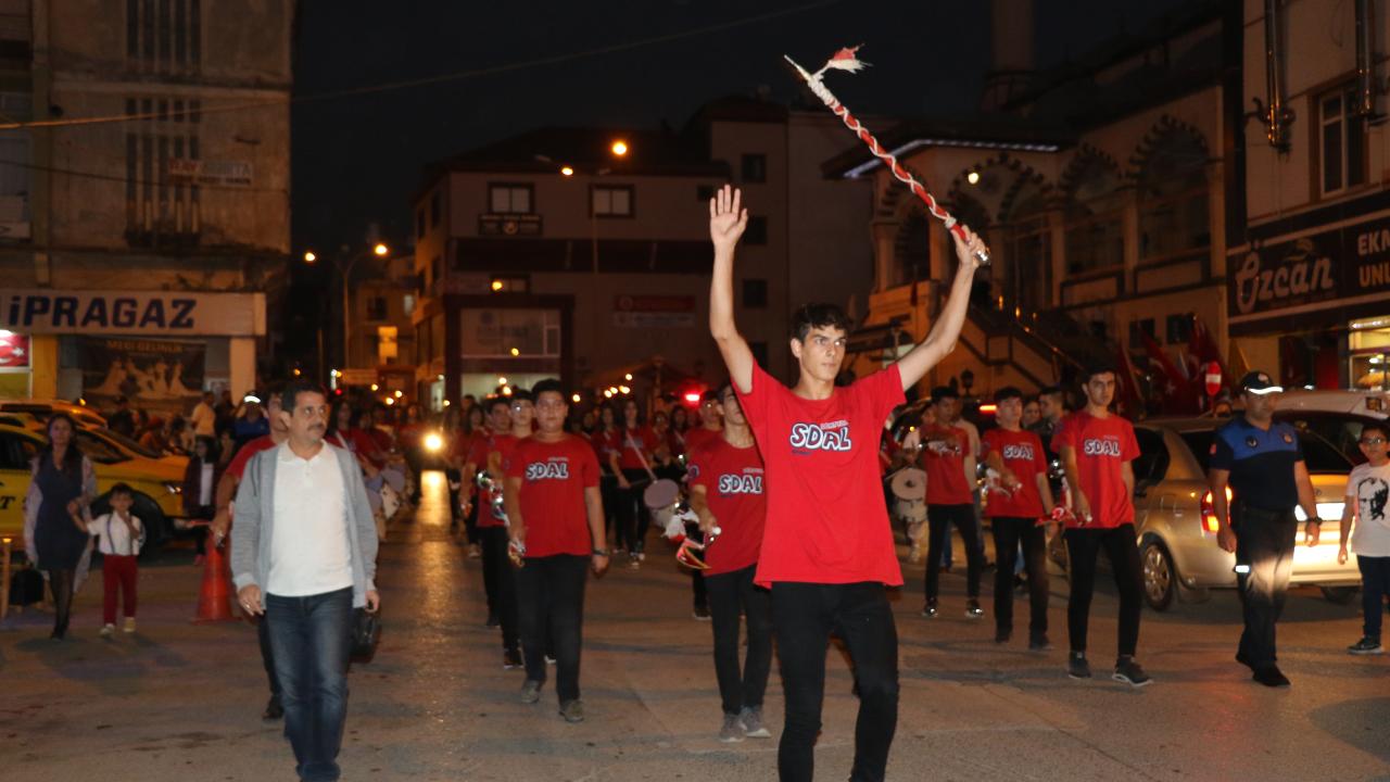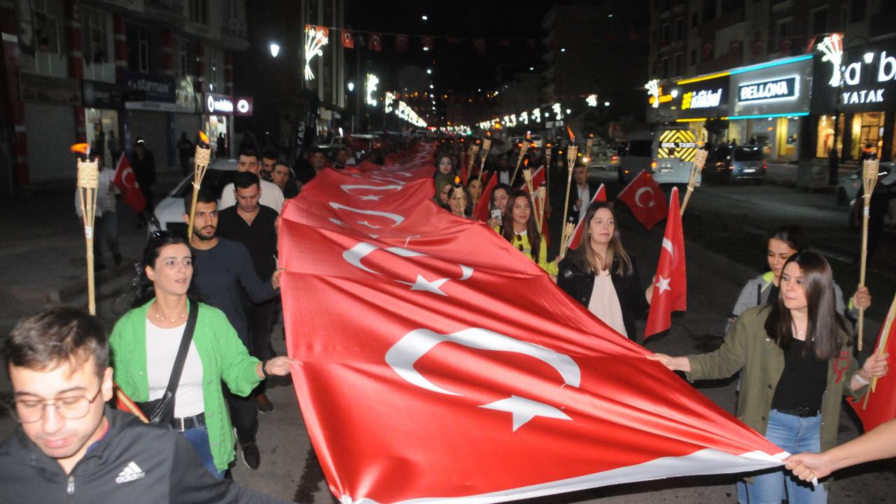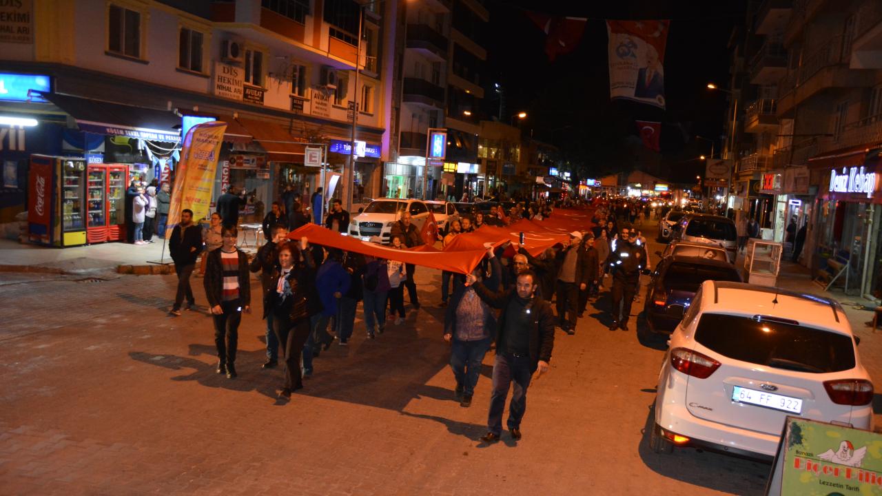 Kaymakamlık tarafından düzenlenen etkinlikte İlçe Jandarma Komutanlığı önünde bir araya gelen vatandaşlar, ellerinde dev Türk bayrakları, Atatürk`ün fotoğrafları ve meşalelerle Cumhuriyet Caddesi`ne kadar yürüdü.