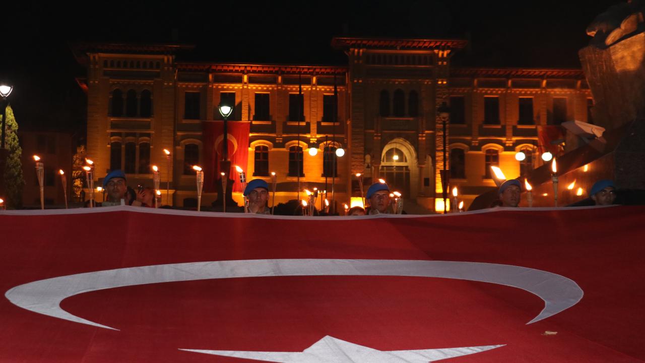 Kastamonu Valiliği tarafından organize edilen yürüyüş için Kışla Parkı`nda toplanan protokol ve vatandaşlar ellerindeki fener ve Türk bayraklarıyla Cumhuriyet Meydanı`na kadar yürüdü.