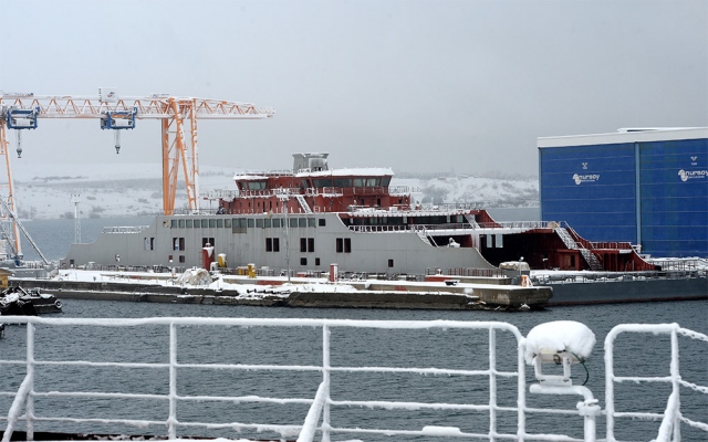 Tersanedeki havuzda çelik inşası tamamlanan ve iç donanımına başlanan ikiz feribotun ise gelecek yıl nisanda sefere başlaması hedefleniyor.